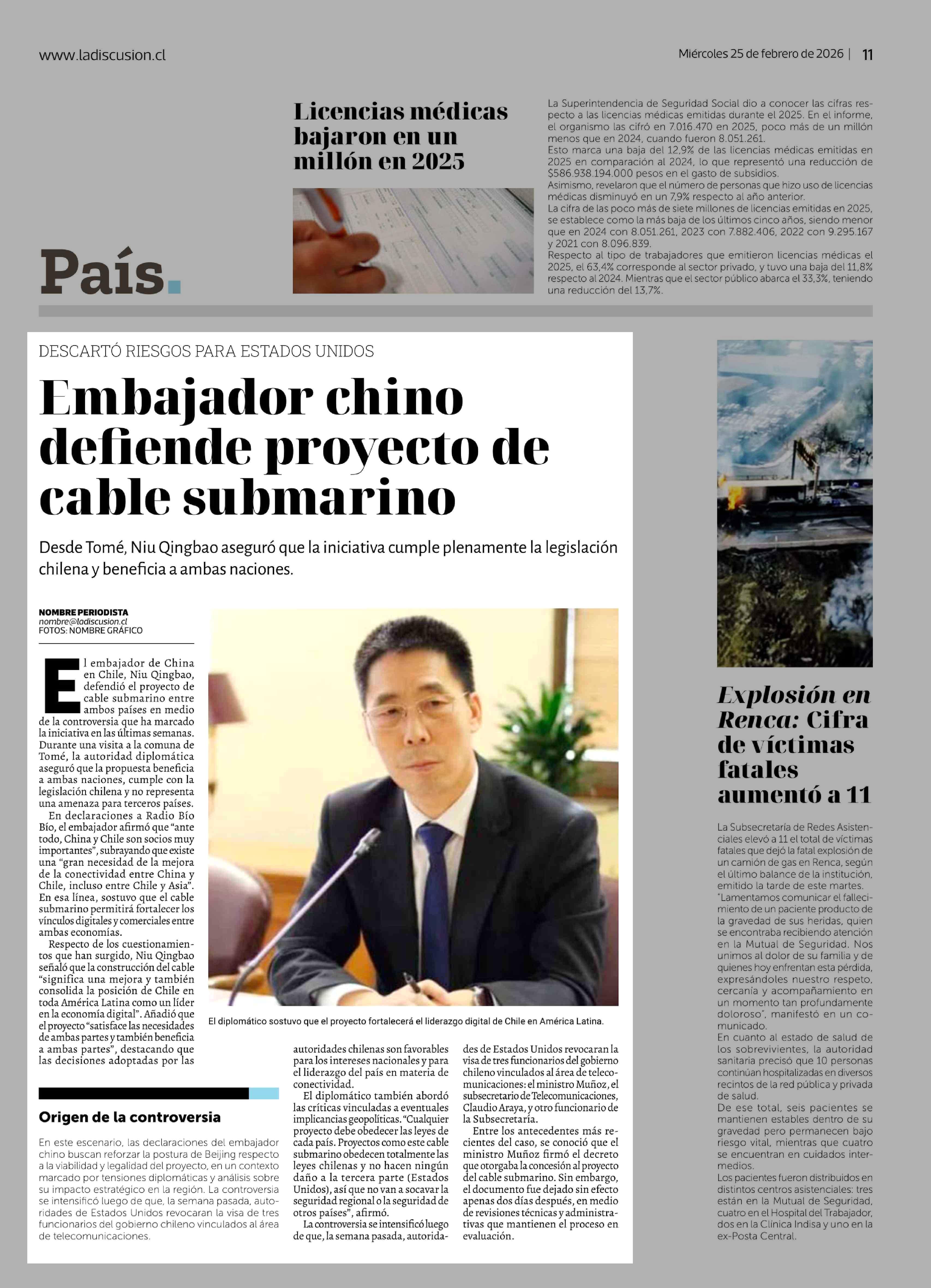 Embajador chino defiende proyecto de cable submarino 25-02-2026 La Discusión |