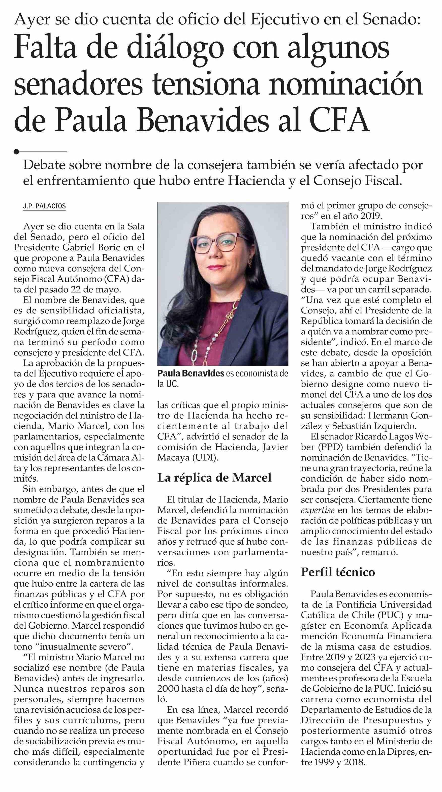Falta de diálogo con algunos senadores tensiona nominación de Paula Benavides al CFA 28-05-2025 El Mercurio |