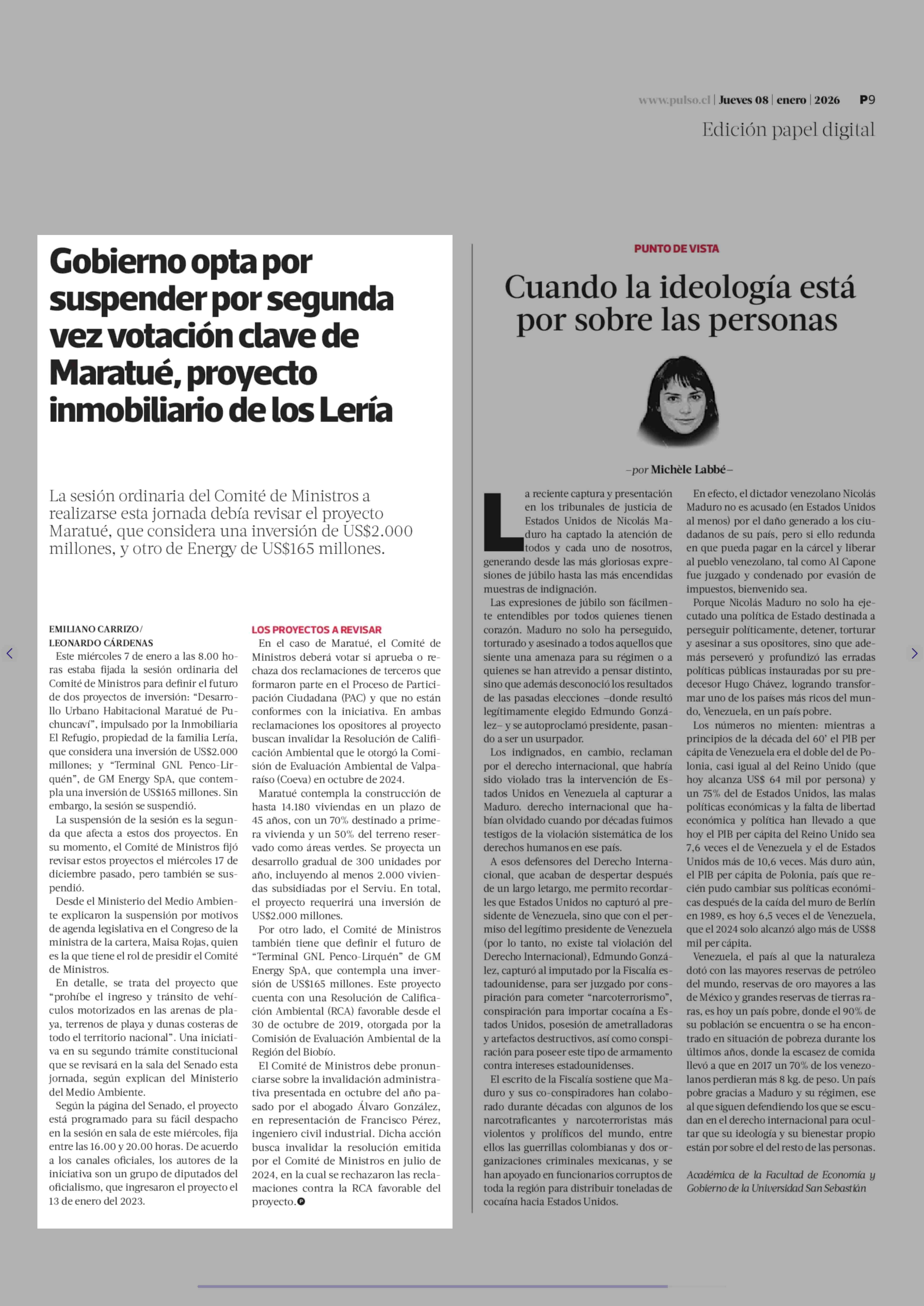 Gobierno opta por suspender por segunda vez votación clave de Maratué, proyecto inmobiliario de los Lería 08-01-2026 La Tercera |