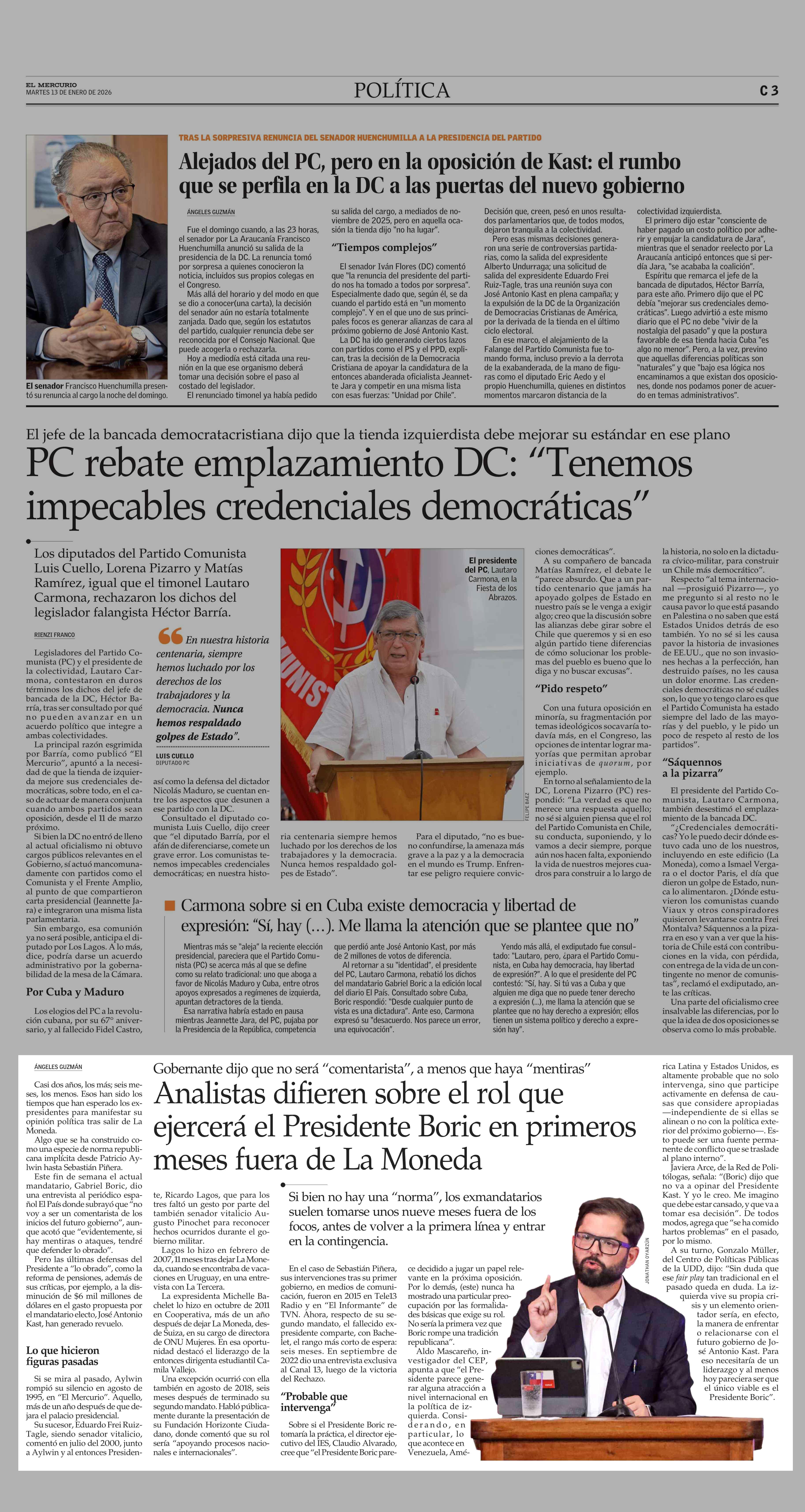 Analistas difieren sobre el rol que ejercerá el Presidente Boric en primeros meses fuera de La Moneda 13-01-2026 El Mercurio |