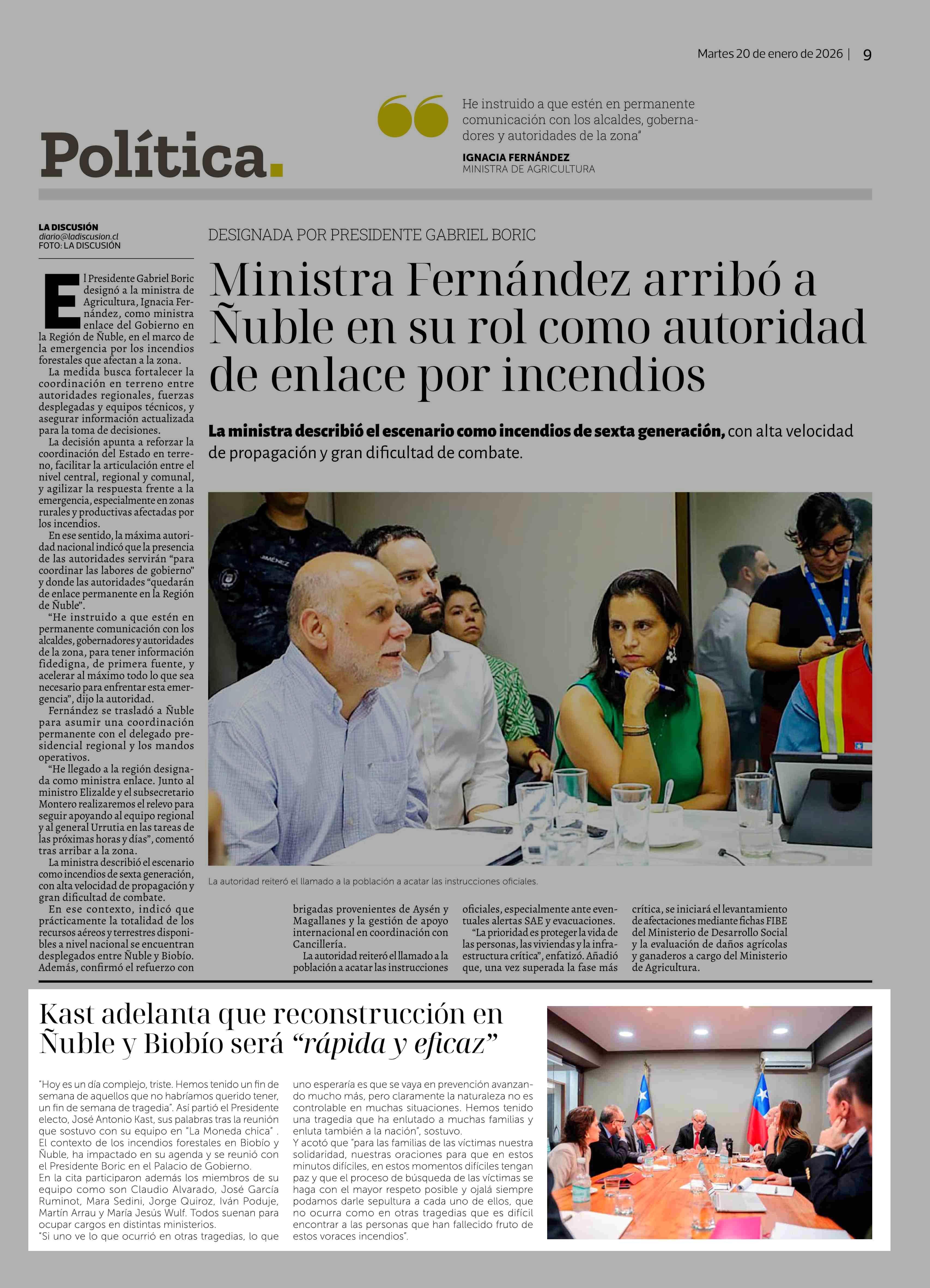 Kast adelanta que reconstrucción en Ñuble y Biobío será "rápida y eficaz" 20-01-2026 La Discusión |