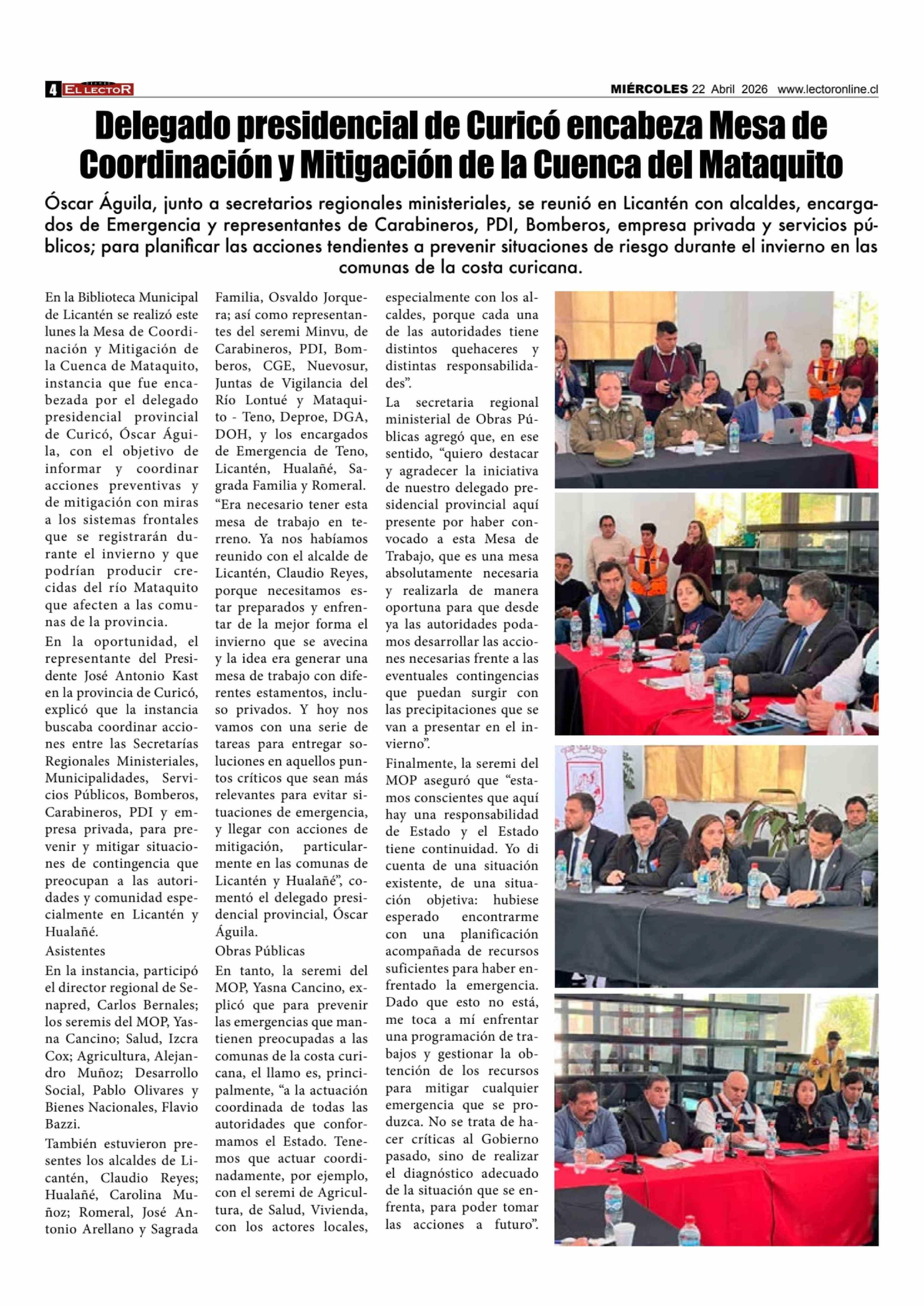 Delegado presidencial de Curicó encabeza Mesa de Coordinación y Mitigación de la Cuenca del Mataquito 23-04-2026 El Lector |