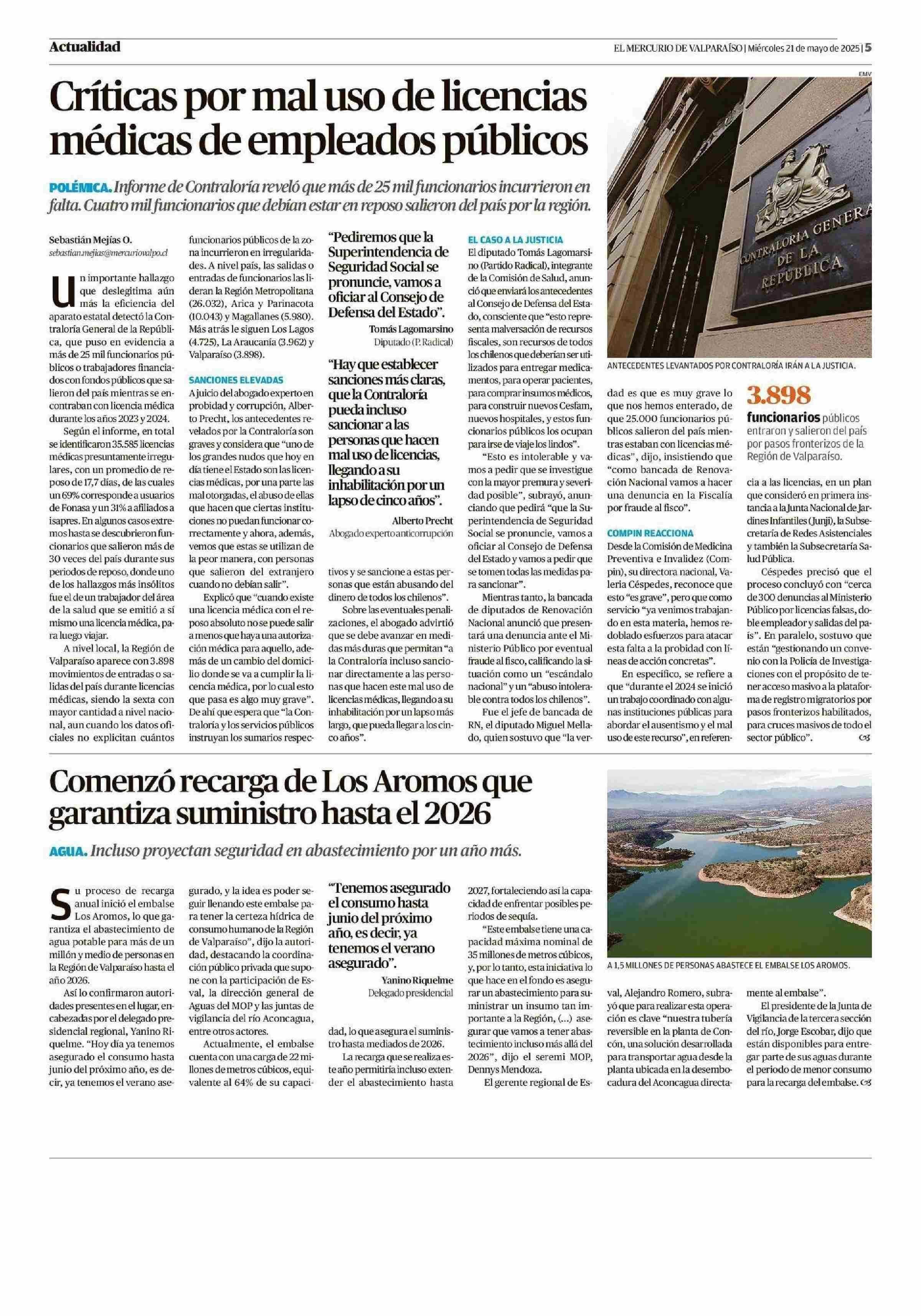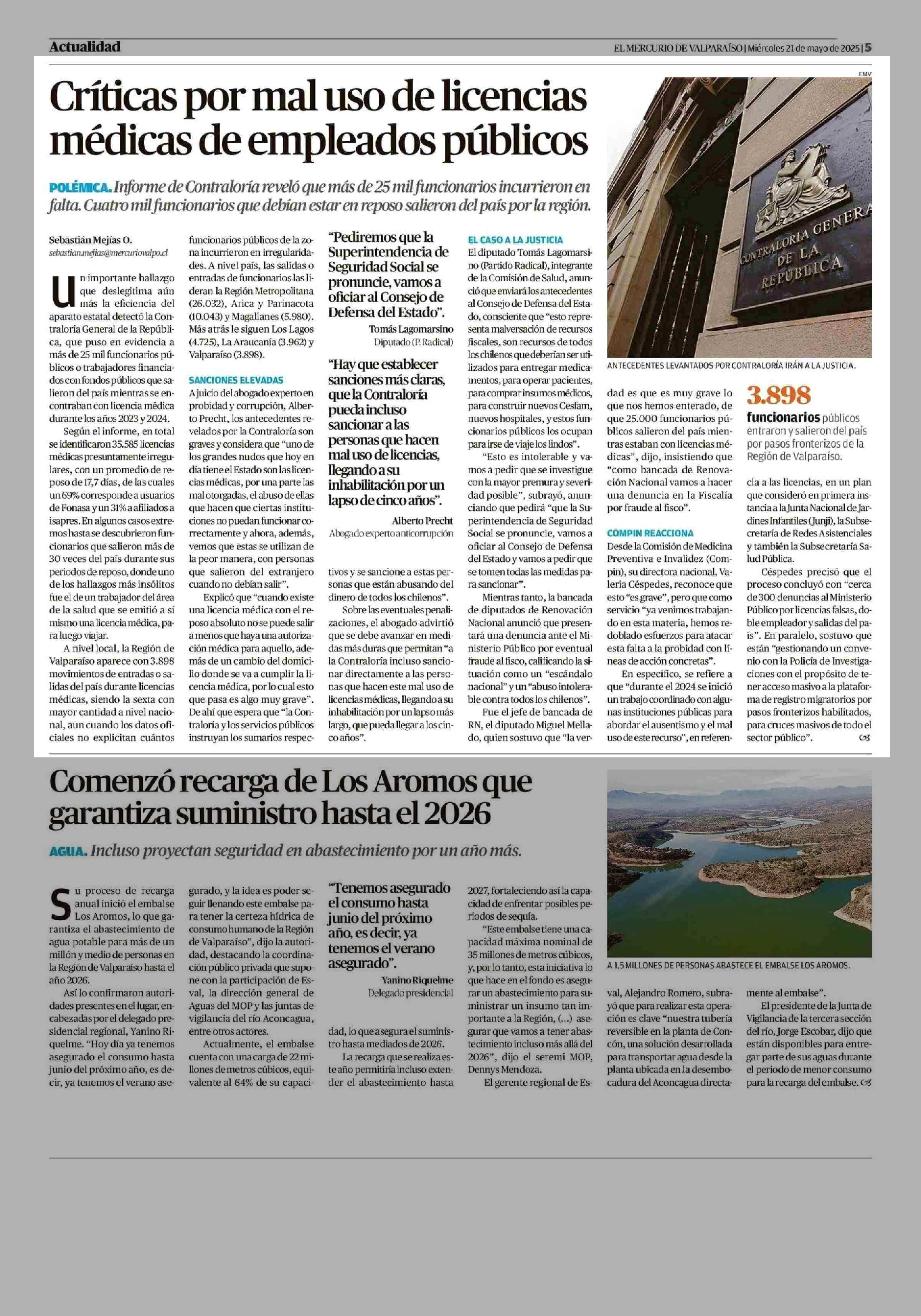 Críticas por mal uso de licencias médicas de empleados públicos 21-05-2025 El Mercurio de Valparaíso |
