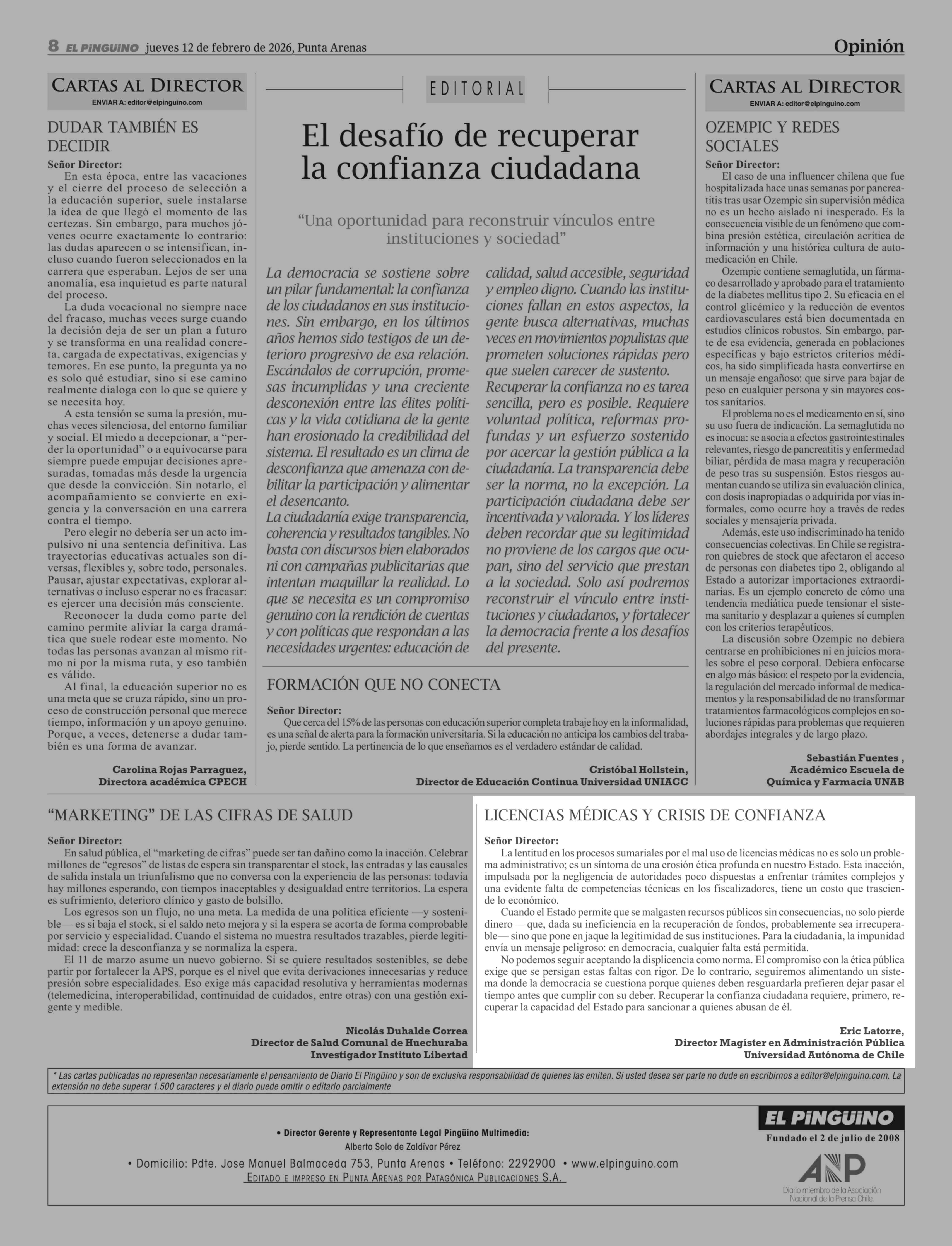 Cartas: LICENCIAS MÉDICAS Y CRISIS DE CONFIANZA