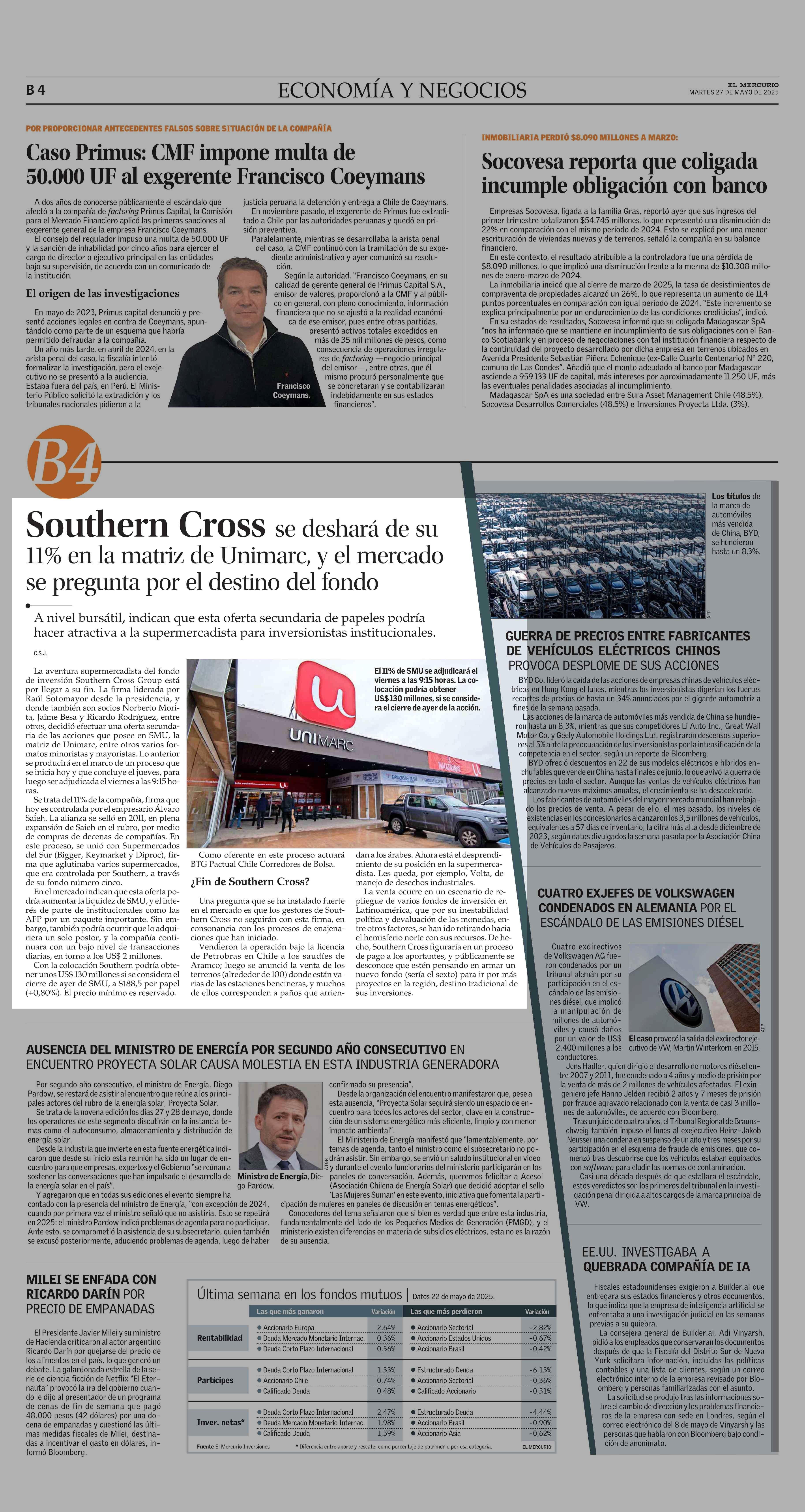 Southern Cross se deshará de su 11% en la matriz de Unimarc, y el mercado se pregunta por el destino del fondo 27-05-2025 El Mercurio |