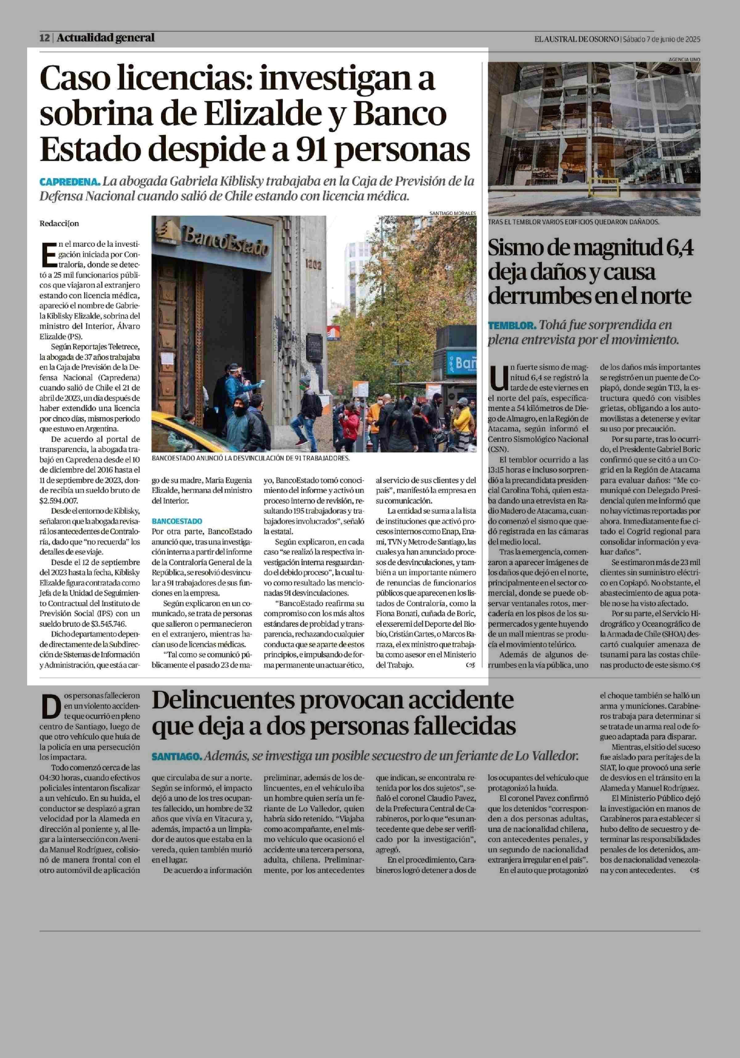 Caso licencias: investigan a sobrina de Elizalde y Banco Estado despide a 91 personas 07-06-2025 El Austral de Osorno |