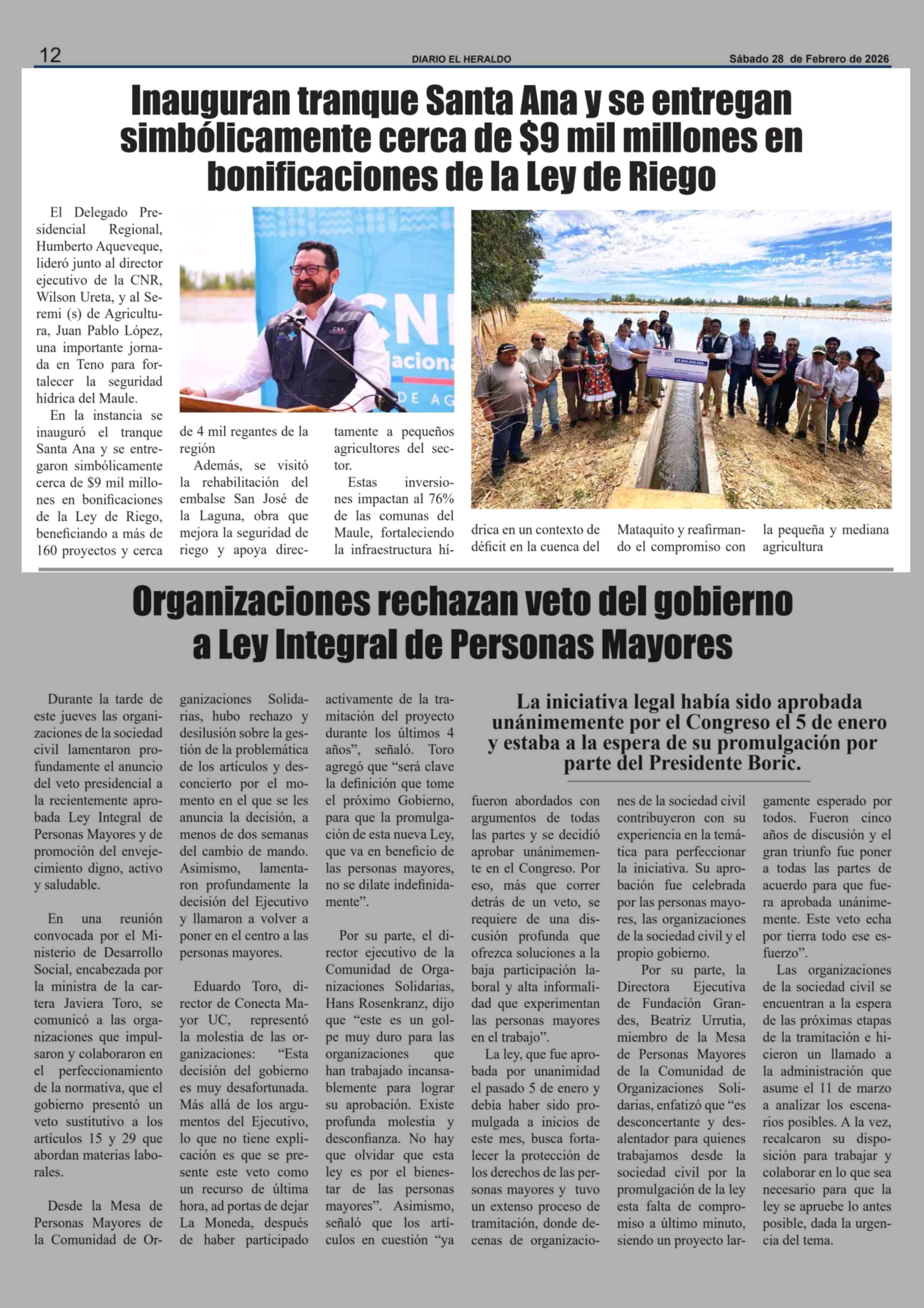 Inauguran tranque Santa Ana y se entregan simbólicamente cerca de $9 mil millones en bonificaciones de la Ley de Riego 28-02-2026 El Heraldo |