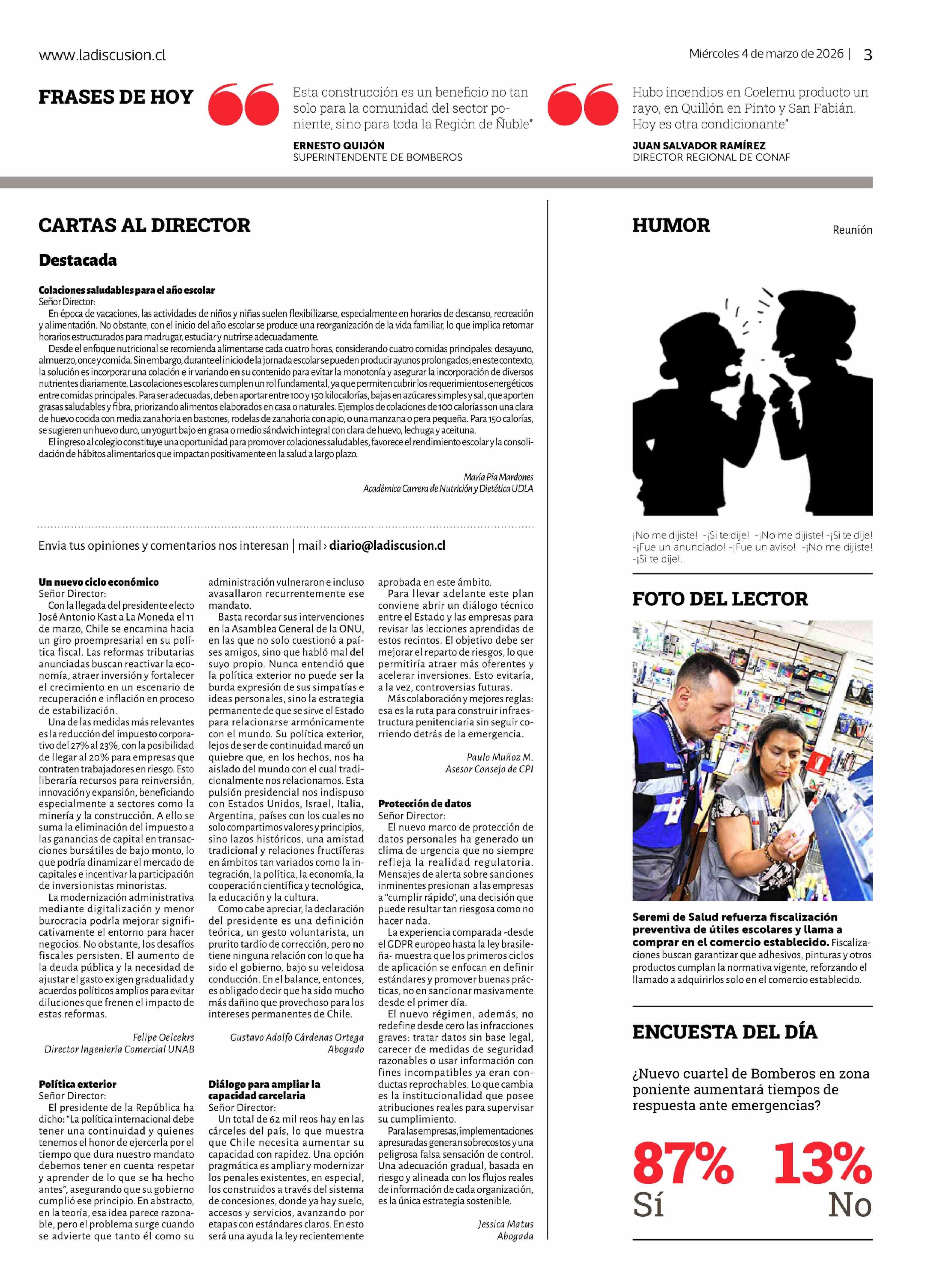 Título: Cartas: Colaciones saludables para el año escolar Señor Director: En época de vacaciones, las actividades de niños y niñas suelen flexibilizarse, especialmente en horarios de descanso, recreación y alimentación. No obstante, con el inicio del año escolar se produce una reorganización de la vida fami