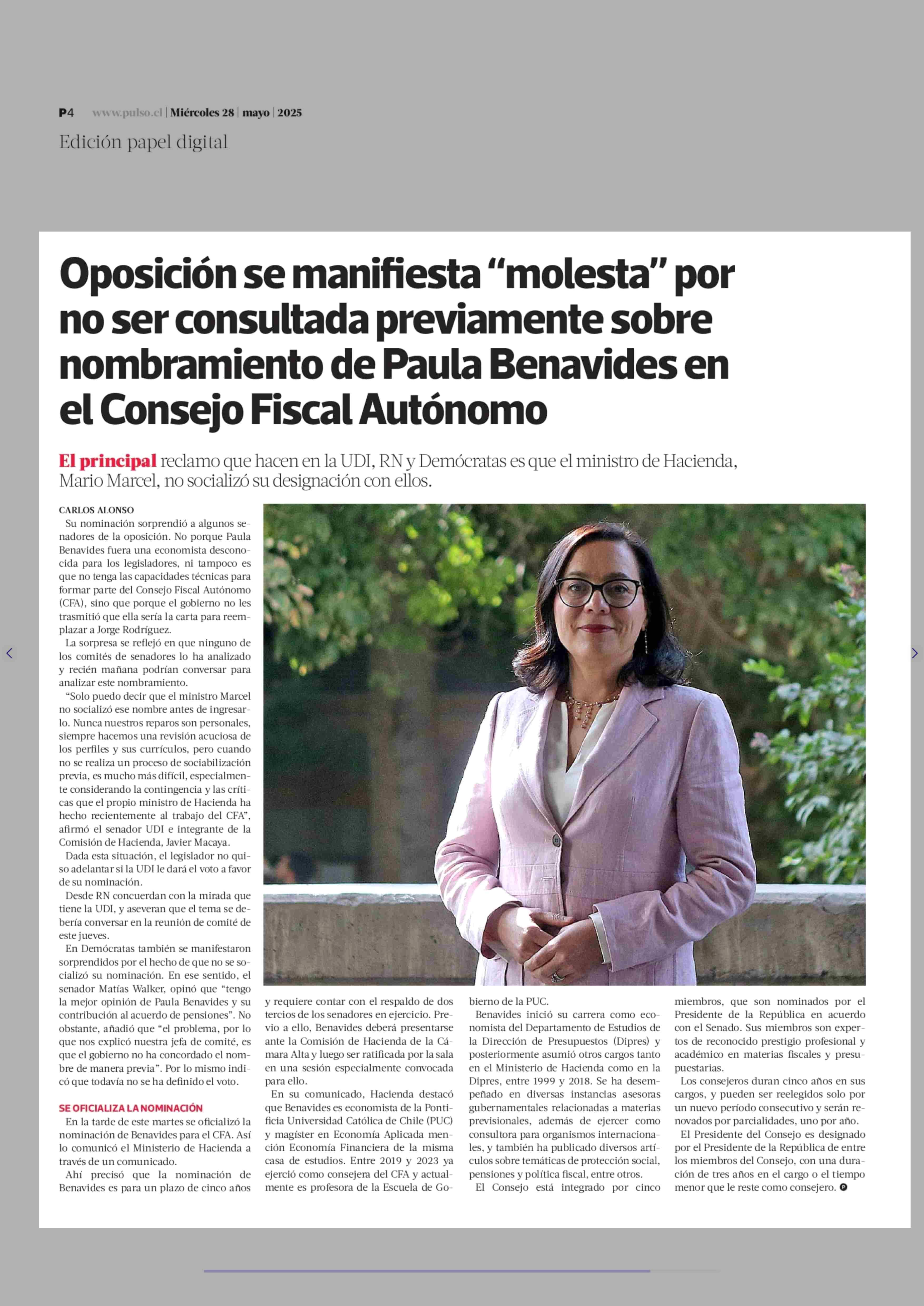 Oposición se manifiesta “molesta” por no ser consultada previamente sobre nombramiento de Paula Benavides en el Consejo Fiscal Autónomo 28-05-2025 La Tercera |