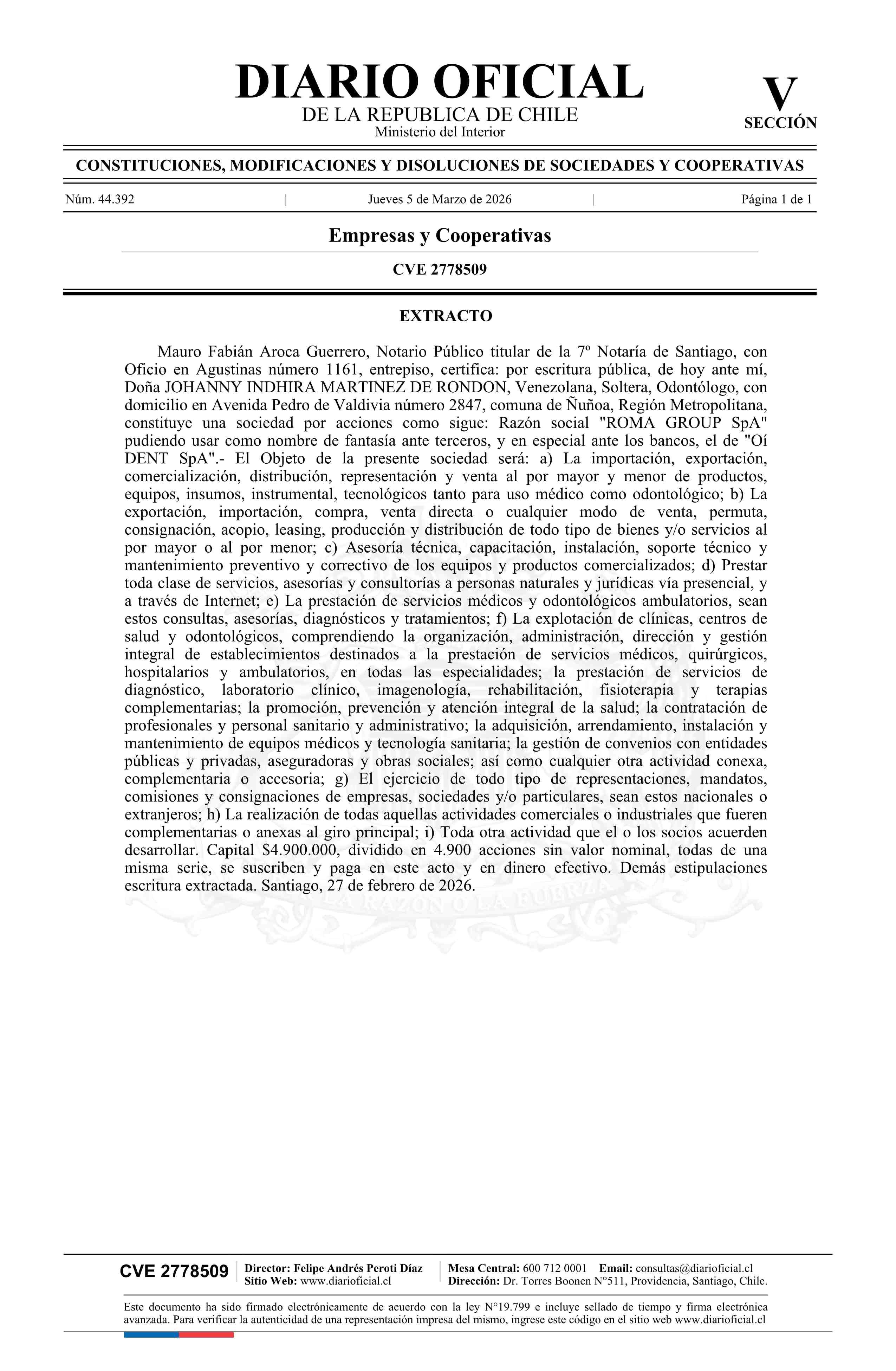 ROMA GROUP SpA 05-03-2026 Diario Oficial Edición Electrónica |