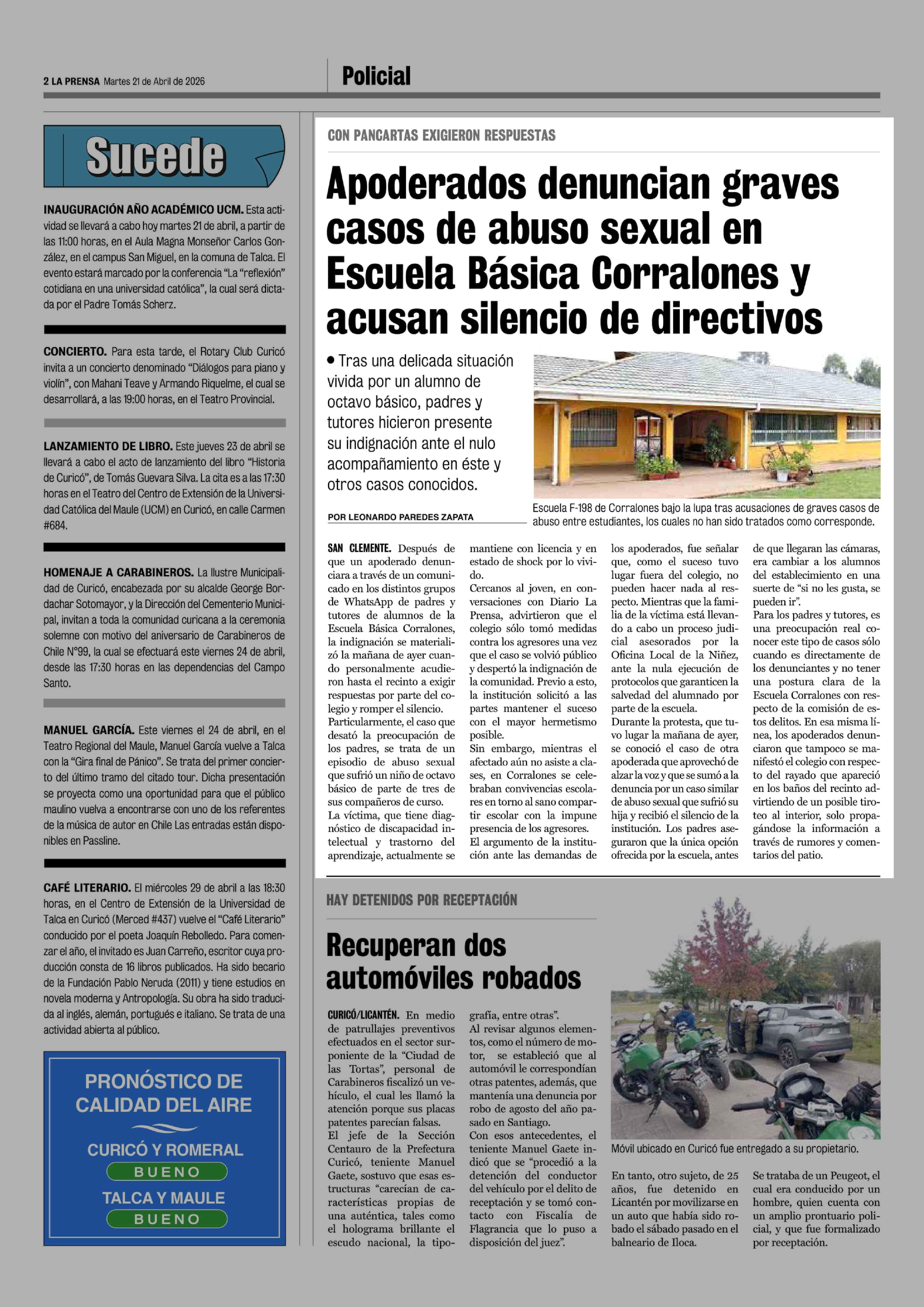 Apoderados denuncian graves casos de abuso sexual en Escuela Básica Corralones y acusan silencio de directivos 21-04-2026 La Prensa de Curicó |
