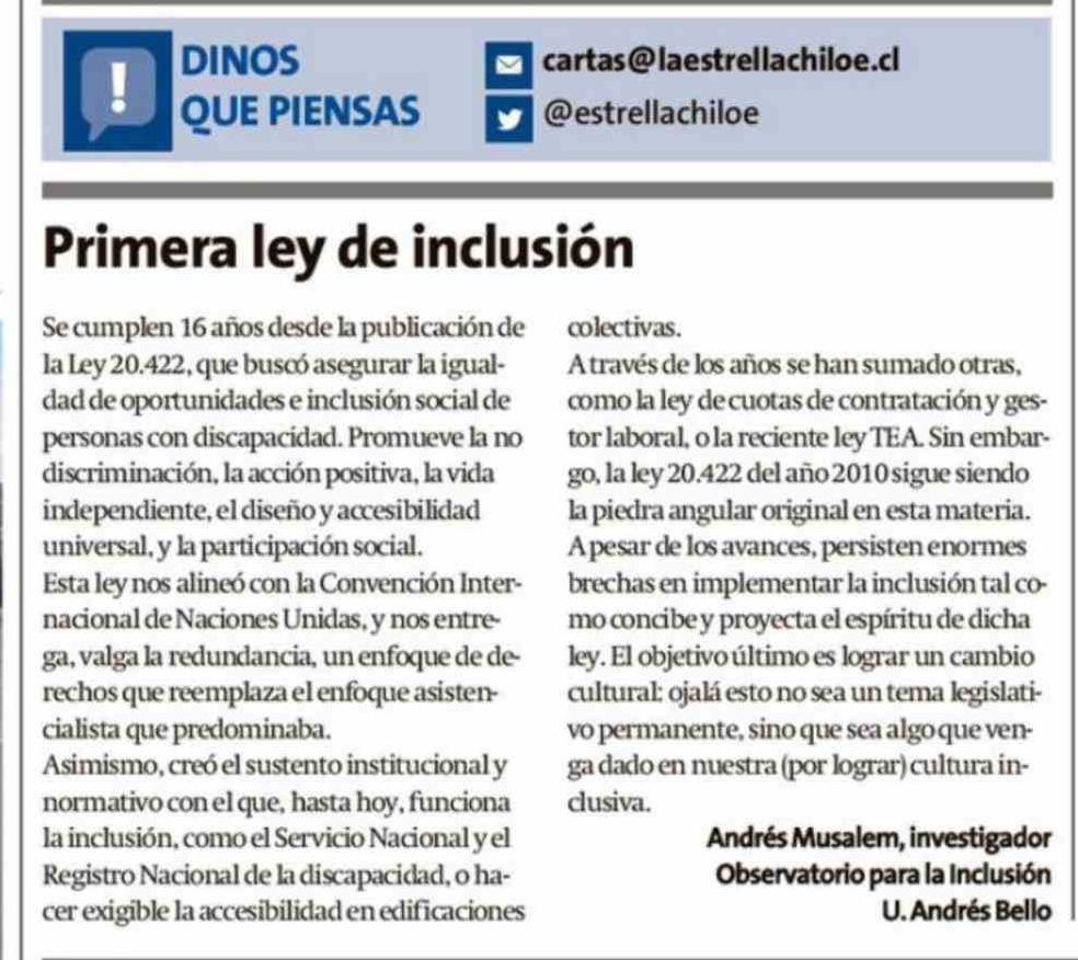 Cartas: Primera ley de inclusión 14-02-2026 La Estrella de Chiloé |