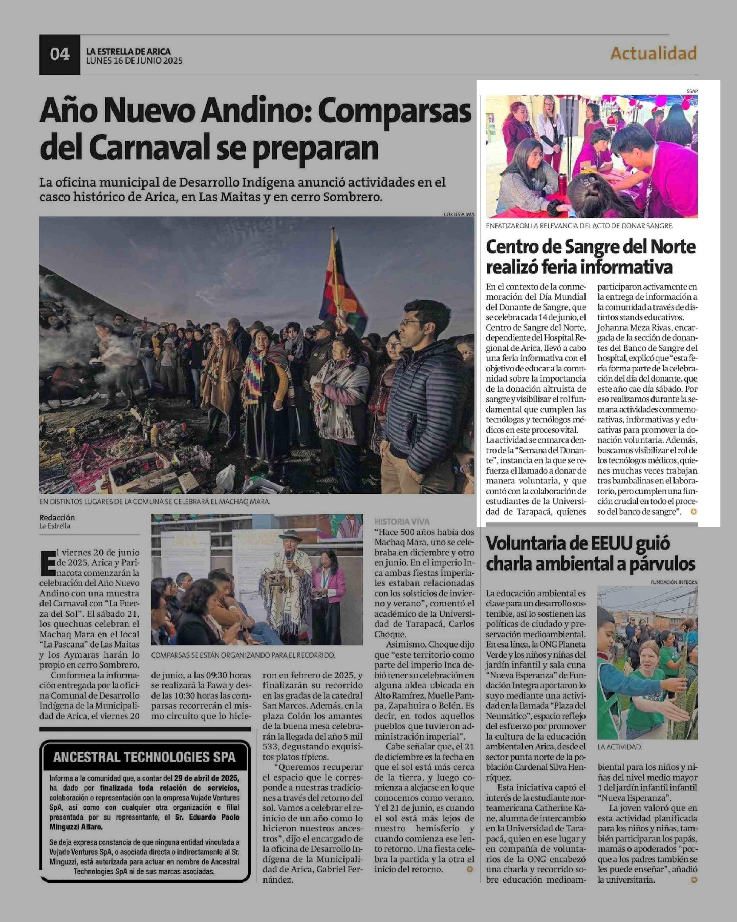 | Fecha: | 16-06-2025 | Sector: | Noticia general | Región: | Región de Arica y Parinacota |