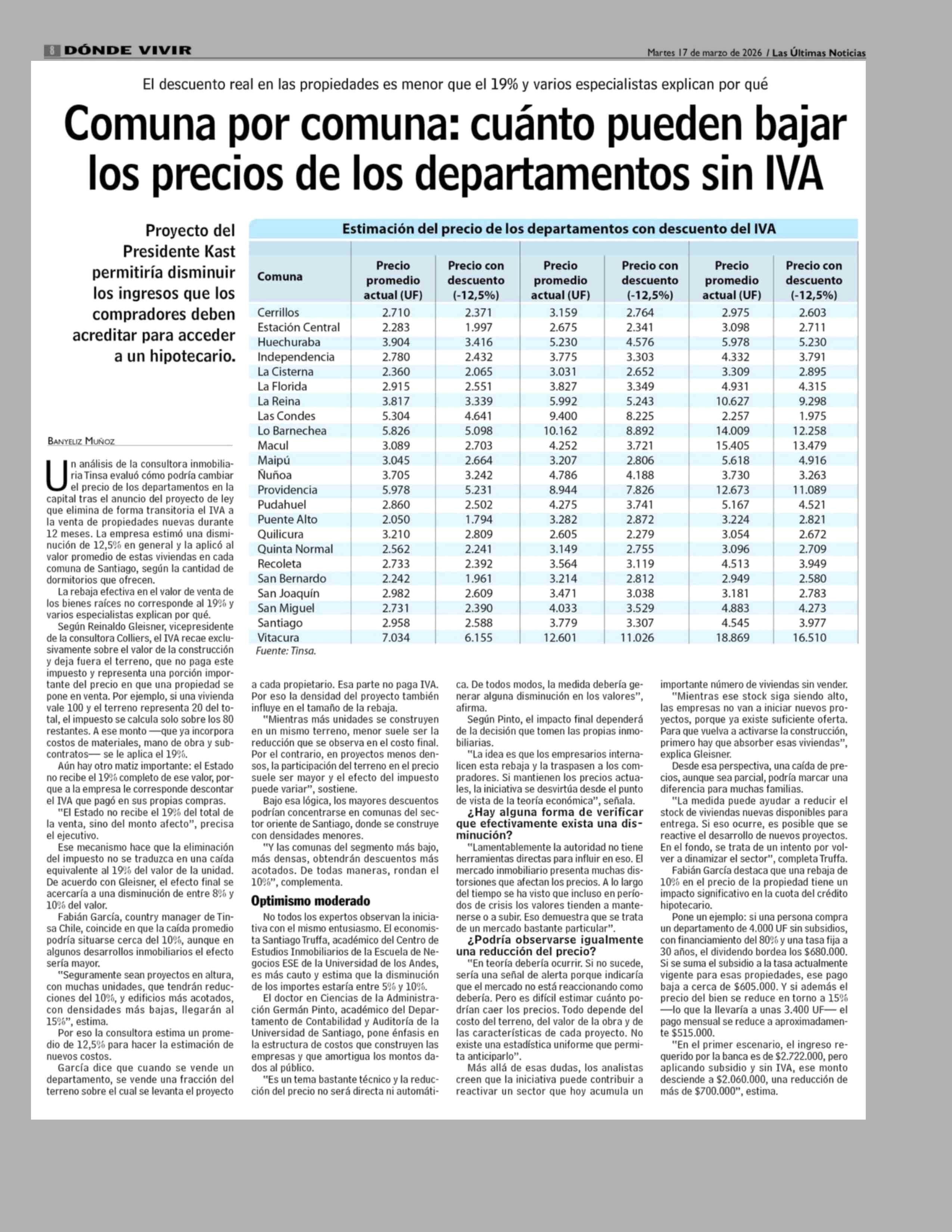 Comuna por comuna: cuanto pueden bajar los precios de los departamentos sin IVA 17-03-2026 Las Últimas Noticias |