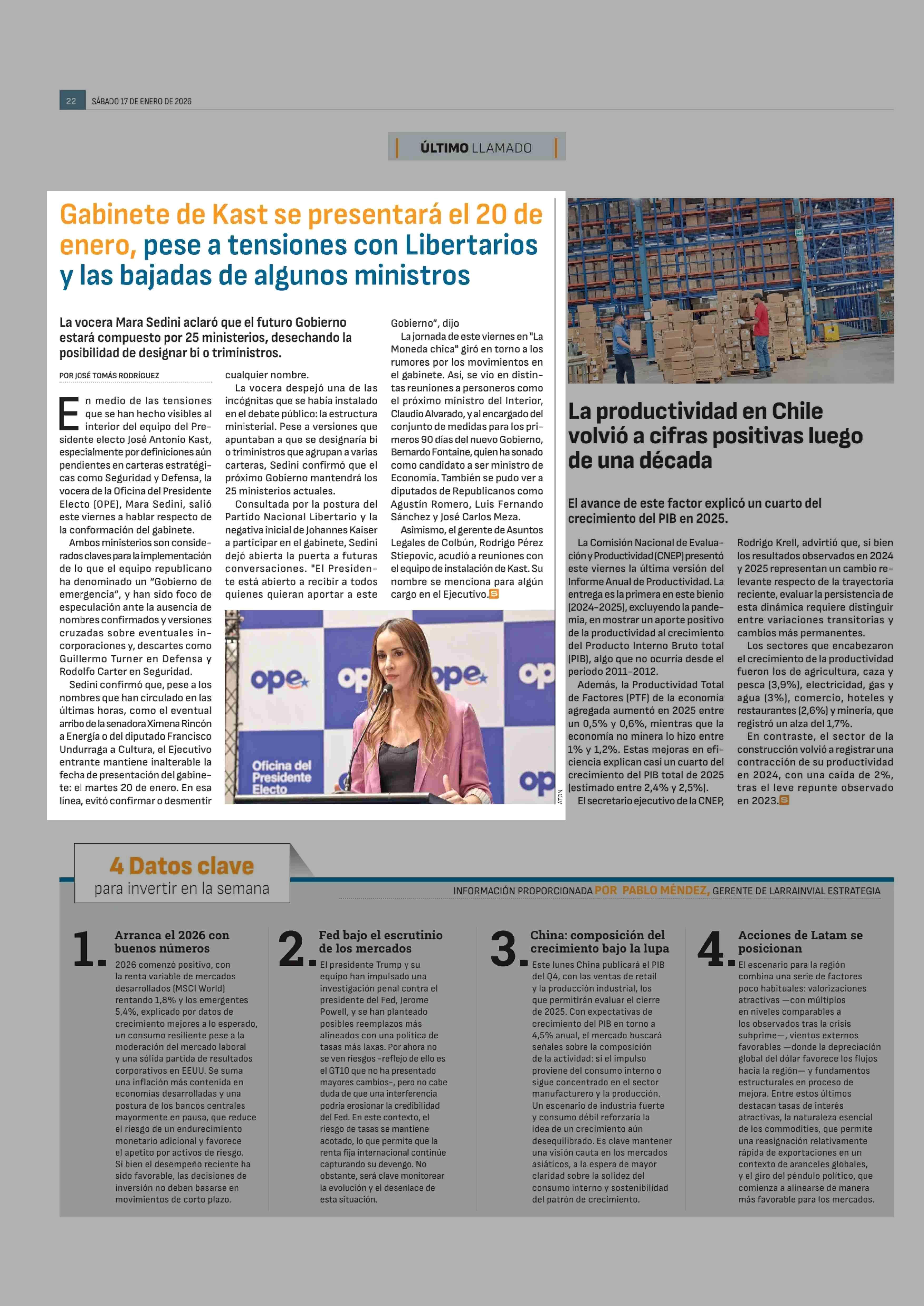 Gabinete de Kast se presentará el 20 de enero, pese a tensiones con Libertarios y las bajadas de algunos ministros 17-01-2026 Diario Financiero |