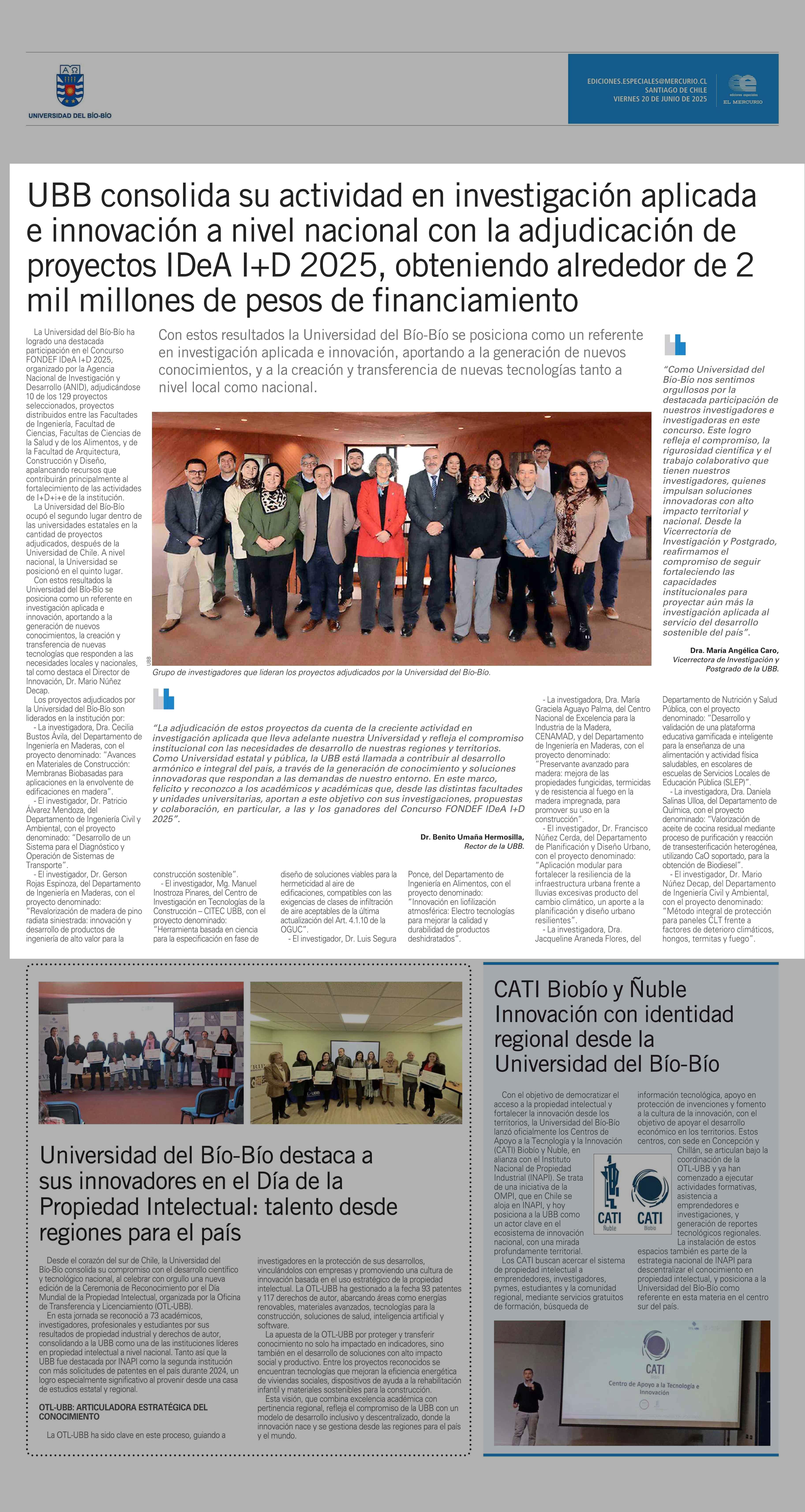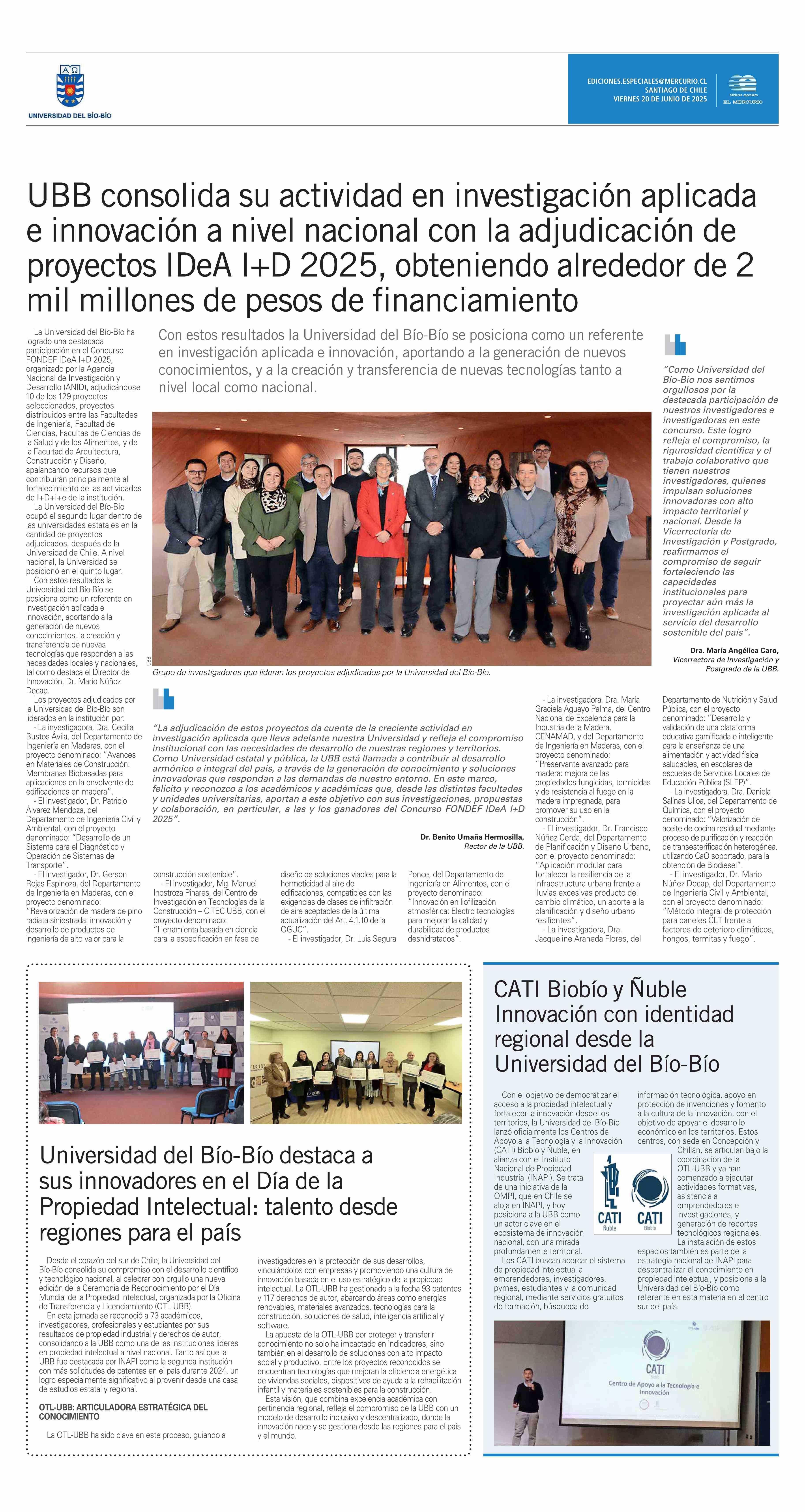 | Título: | UBB consolida su actividad en investigación aplicada e innovación a nivel nacional con la adjudicación de proyectos IDeA |+D 2025, obteniendo alrededor de 2 mil millones de pesos de financiamiento |