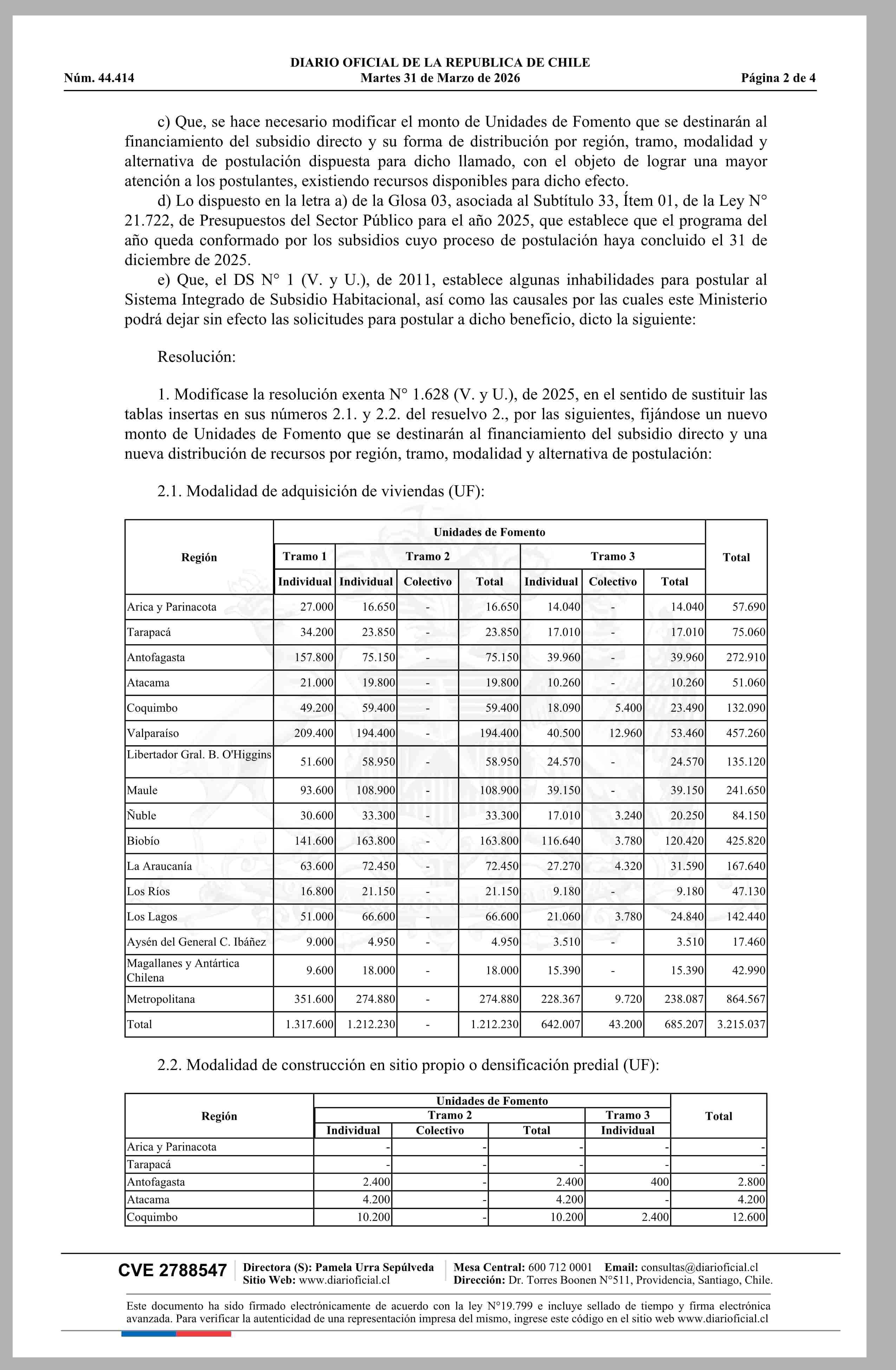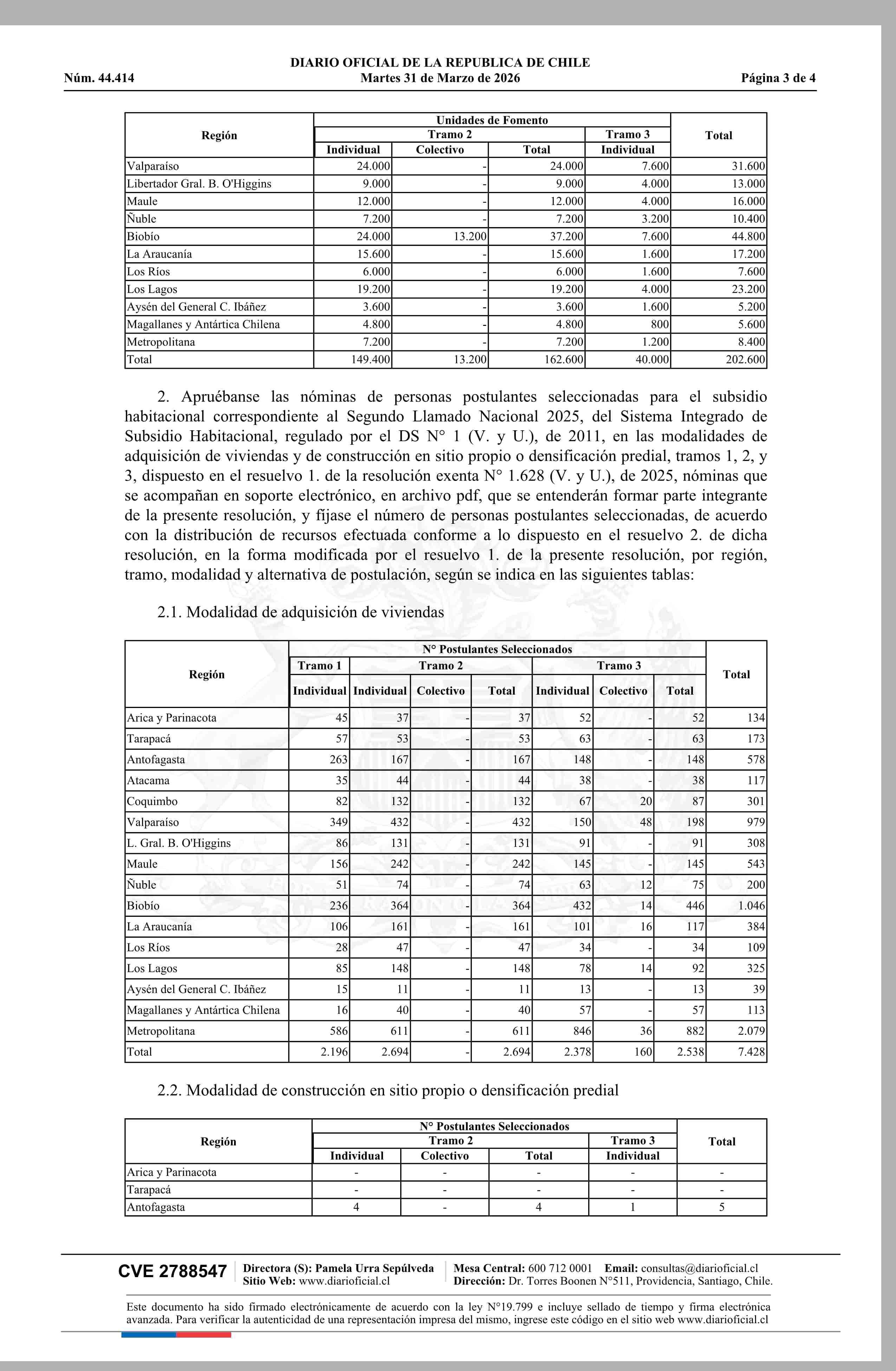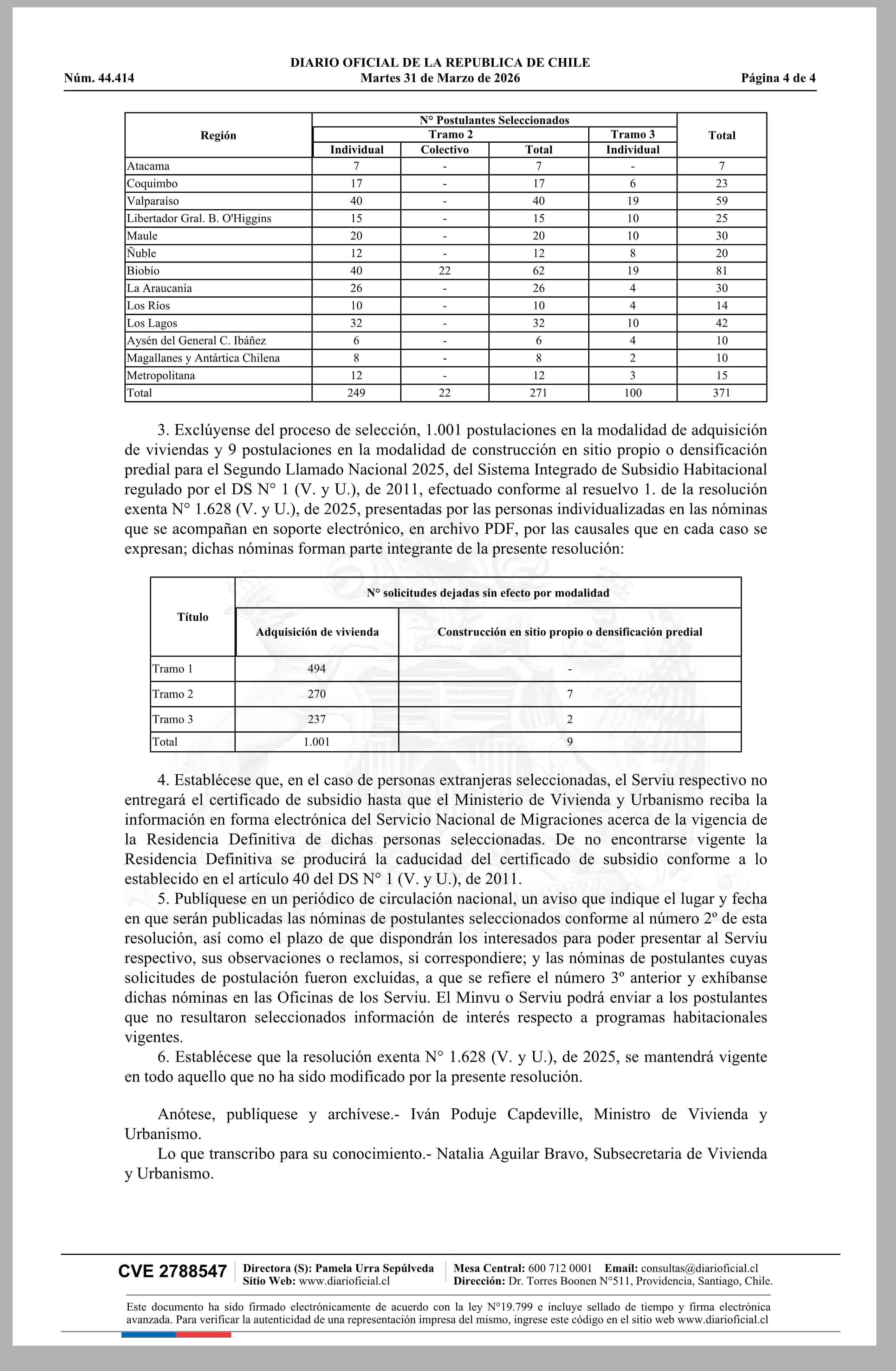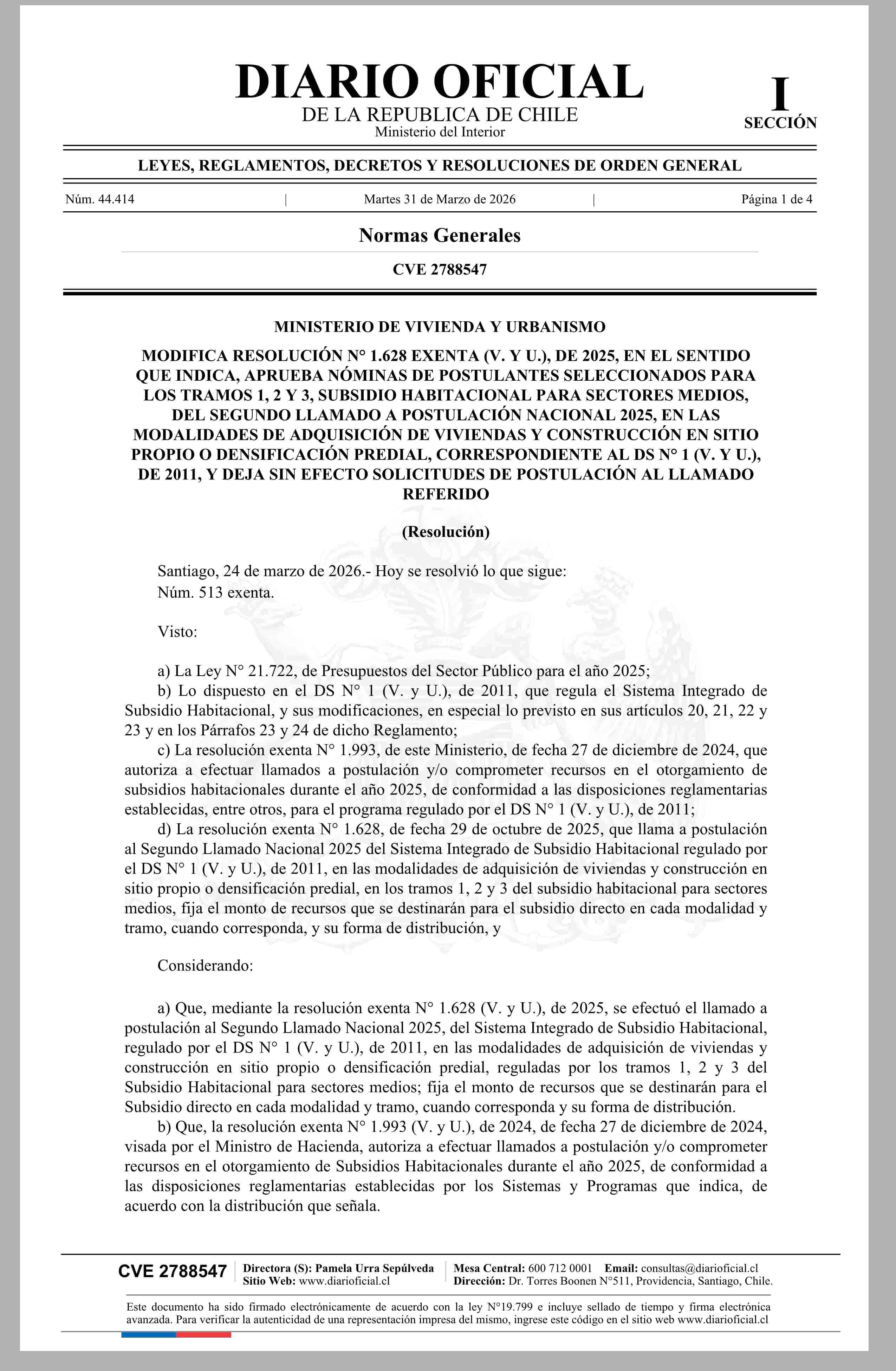 | Título: | MINISTERIO DE VIVIENDA Y URBANISMO MODIFICA RESOLUCIÓN N? 1.628 EXENTA (V. Y U.), DE 2025, EN EL SENTIDO QUE INDICA, APRUEBA NÓMINAS DE POSTULANTES SELECCIONADOS PARA LOS TRAMOS 1, 2 Y 3, SUBSIDIO HABITACIONAL PARA SECTORES MEDIOS, DEL SEGUNDO LLAMADO A POSTULACIÓN NACIONAL 2025, EN LAS MODALIDADES |