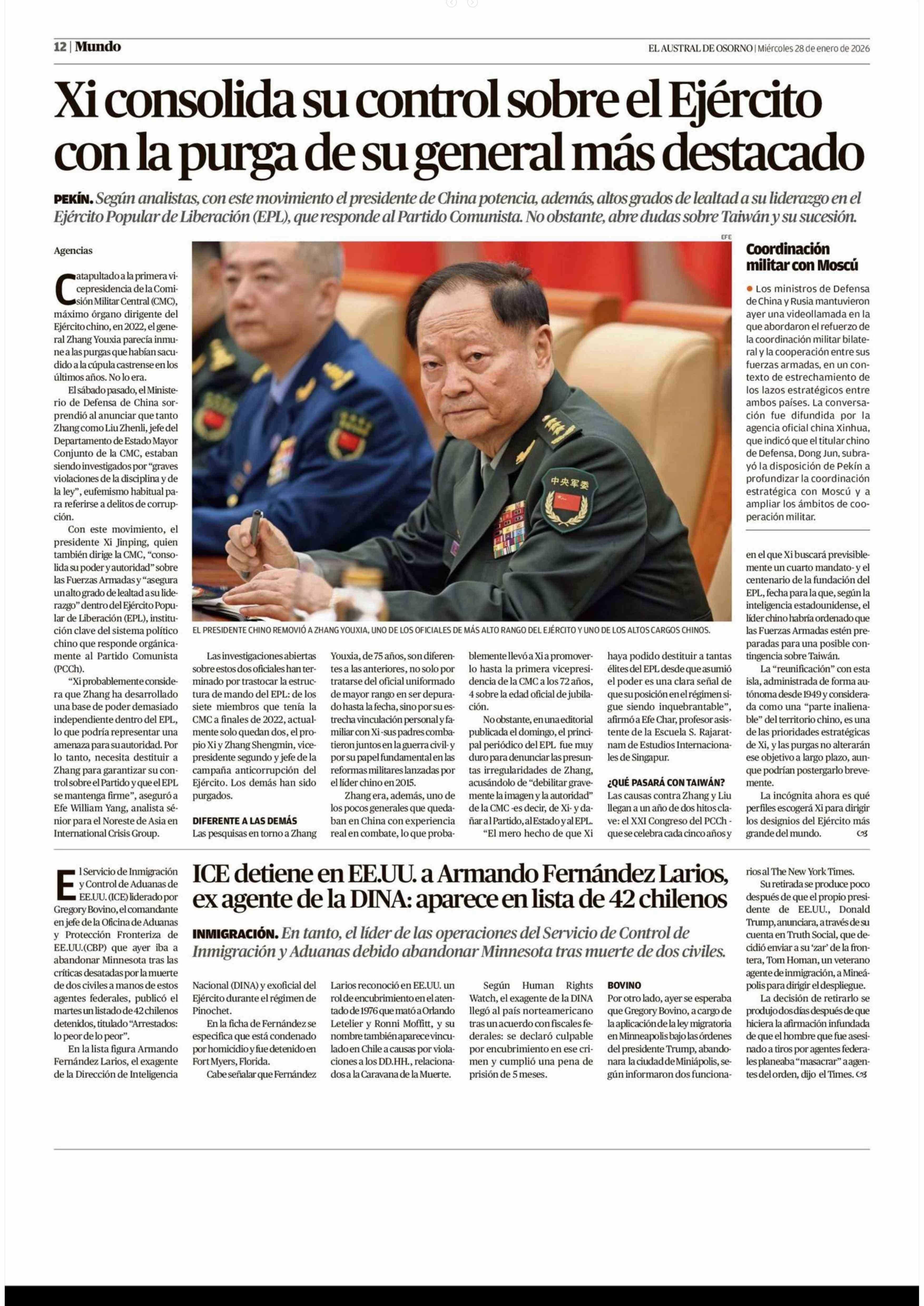 Xi consolida su control sobre el Ejército con la purga de su general más destacado 28-01-2026 El Austral de Osorno |