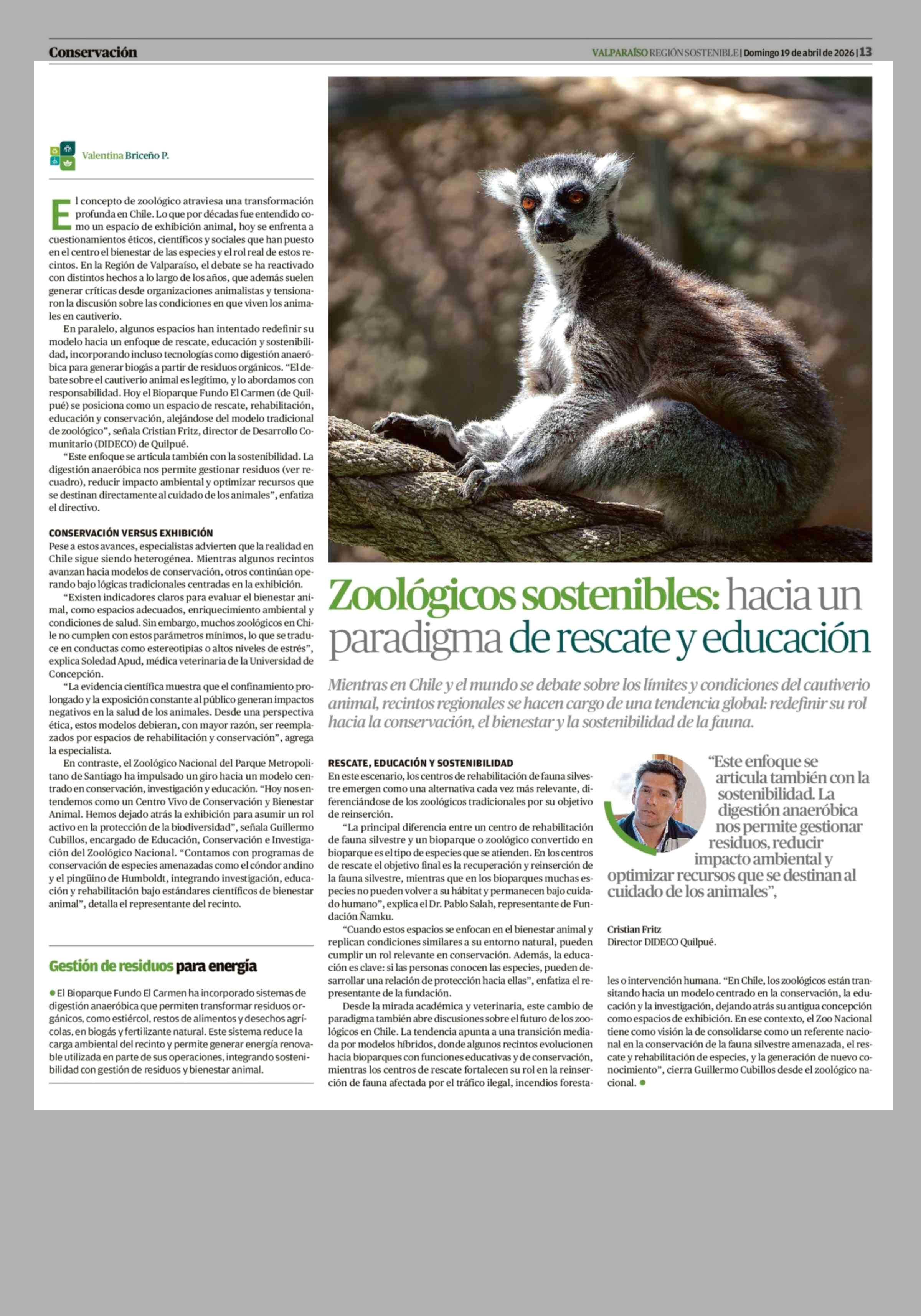 Zoológicos sostenibles: hacia un paradigma de rescate y educación 19-04-2026 El Mercurio de Valparaíso |