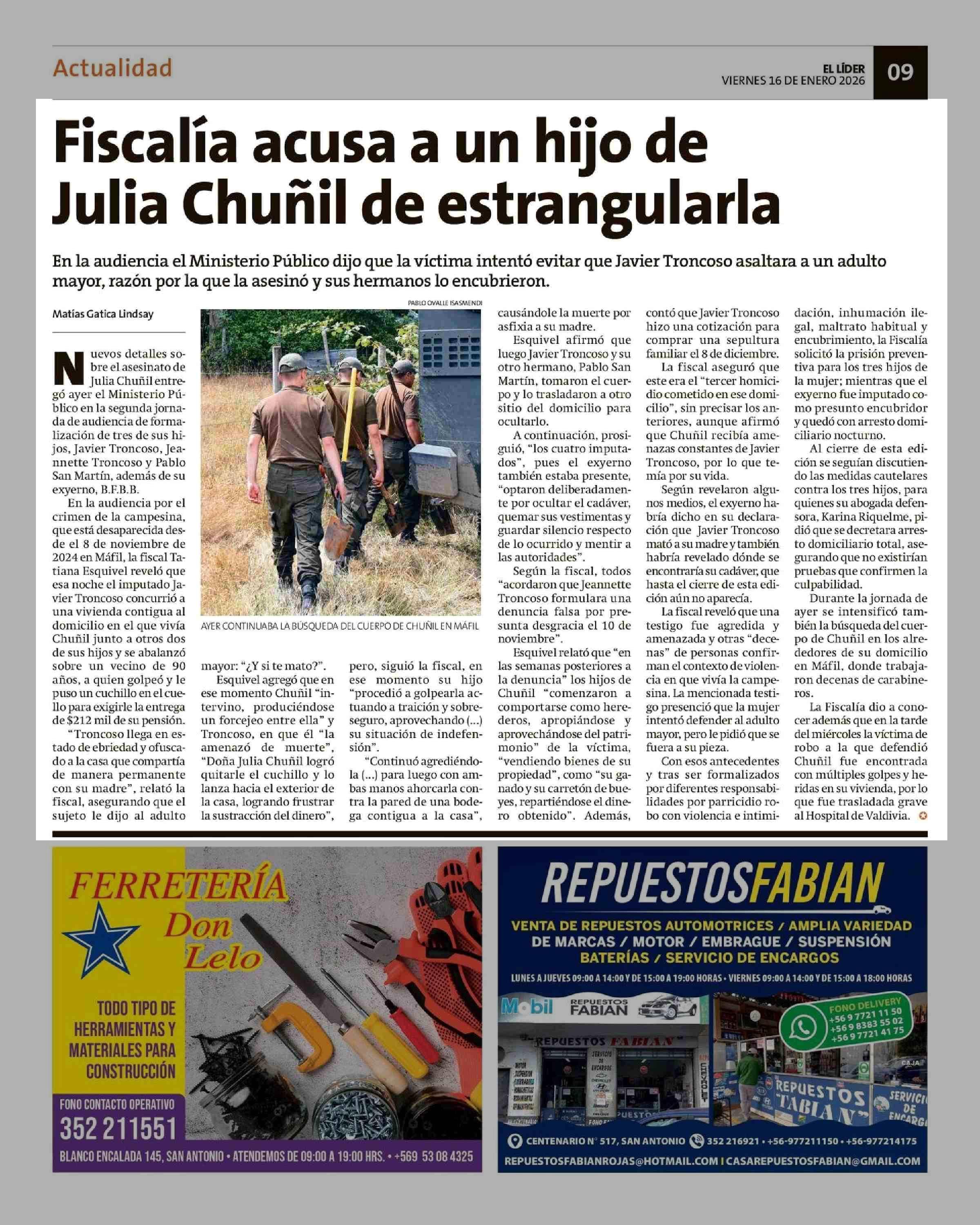 Fiscalía acusa a un hijo de Julia Chunil de estrangularla 16-01-2026 El Líder |