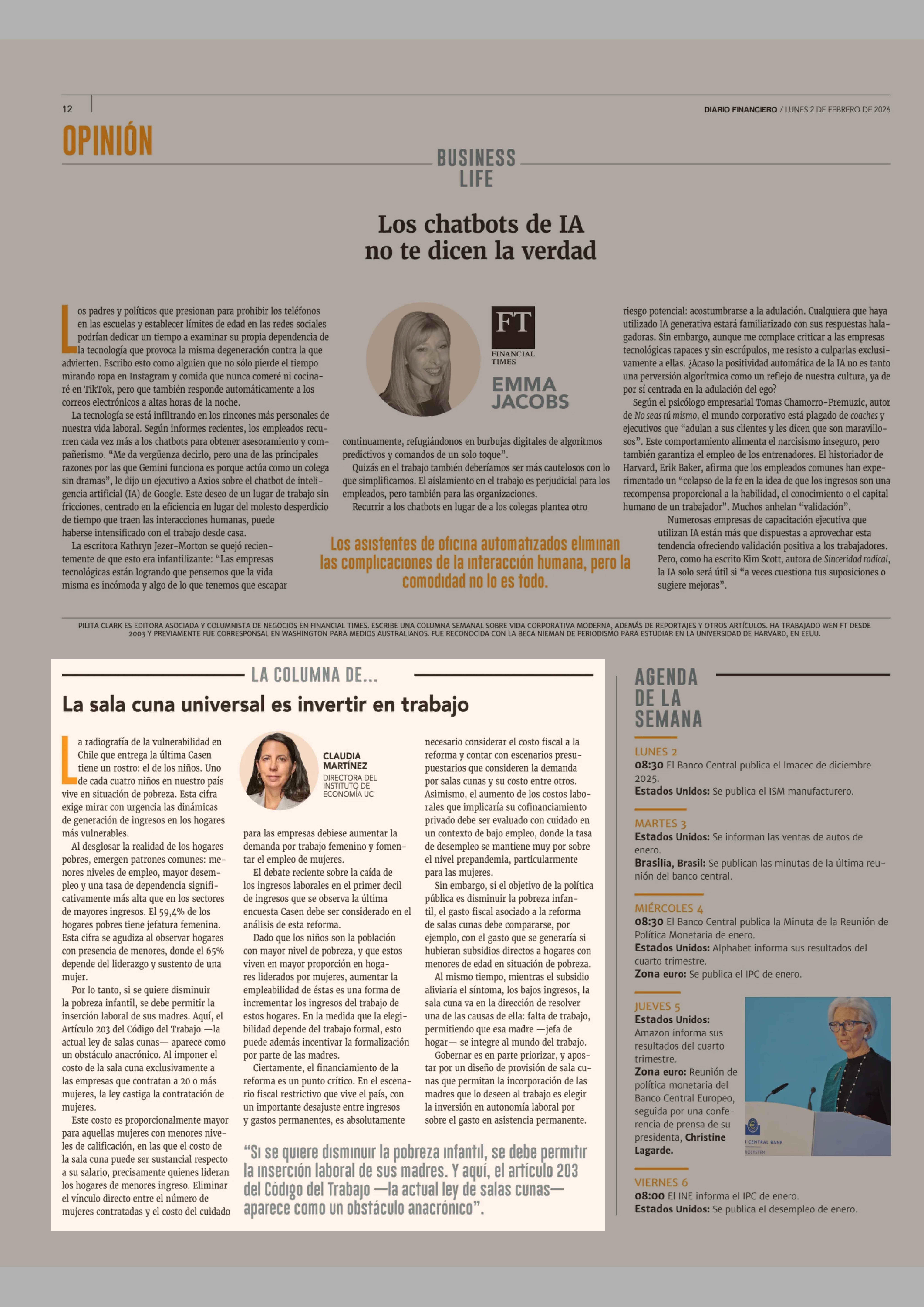 Columnas de Opinión: La sala cuna universal es invertir en trabajo 02-02-2026 Diario Financiero |