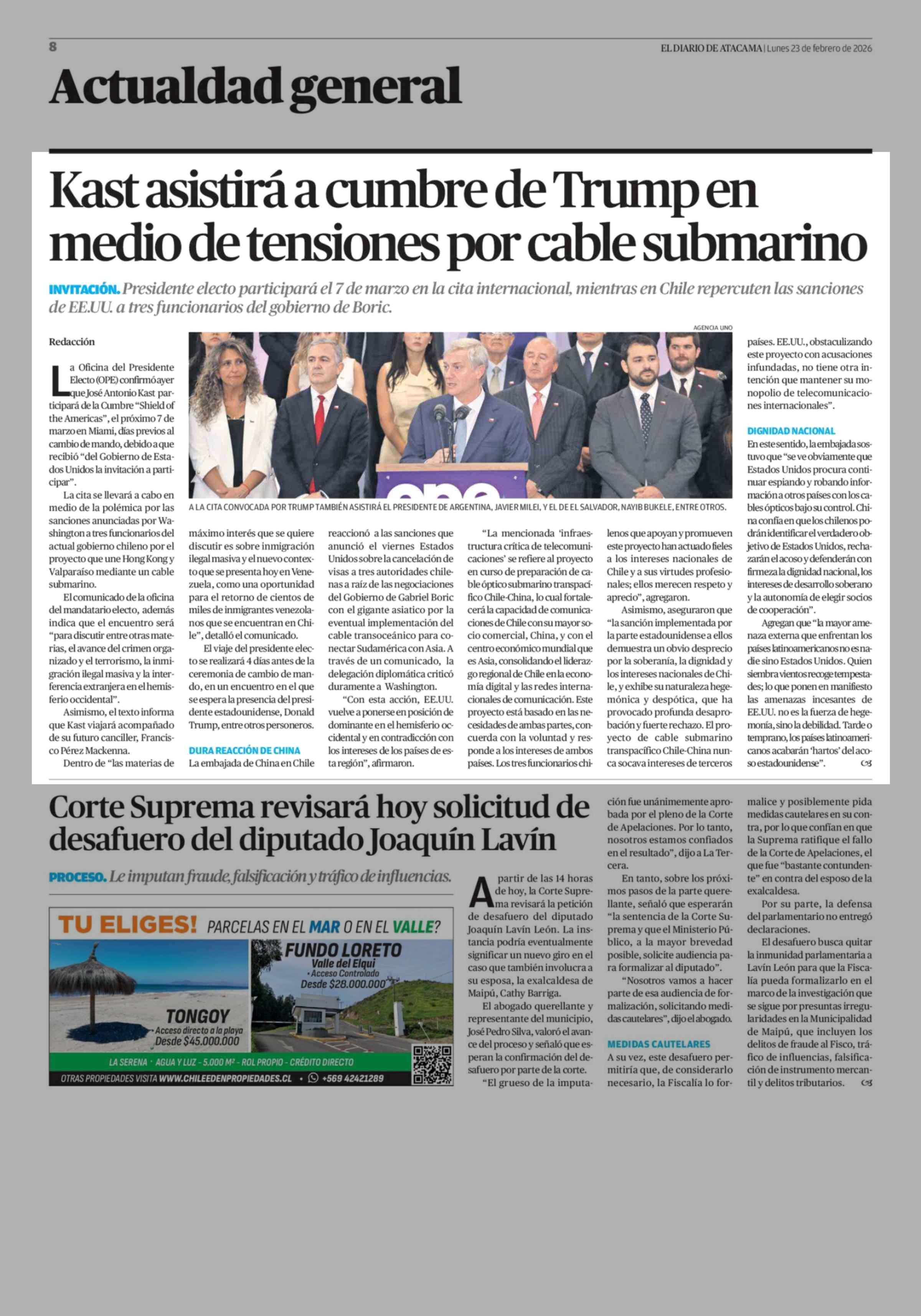 Kast asistirá a cumbre de Trump en medio de tensiones por cable submarino 23-02-2026 El Diario de Atacama |