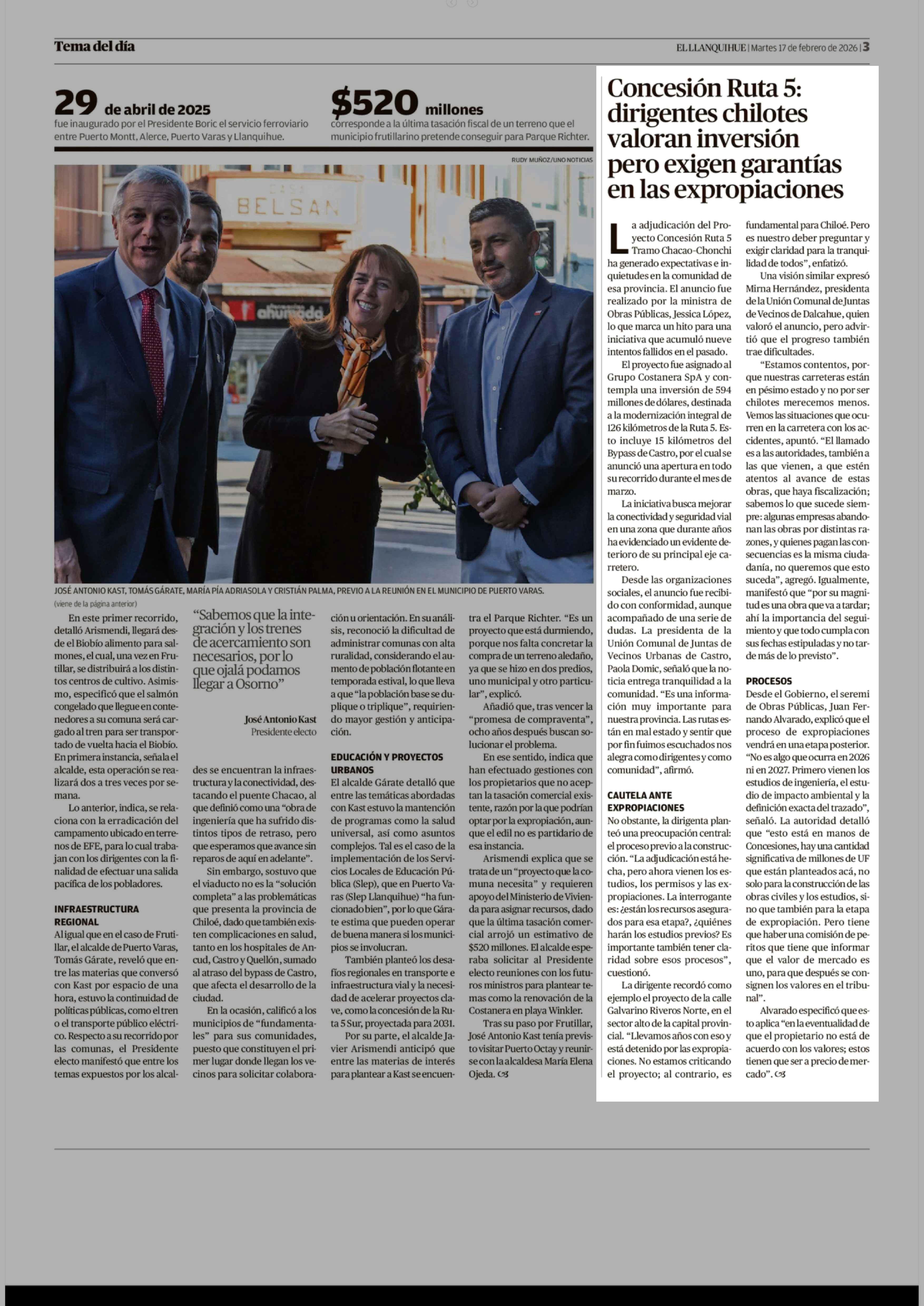 Concesión Ruta 5: dirigentes chilotes valoran inversión pero exigen garantías en las expropiaciones 17-02-2026 El Llanquihue |