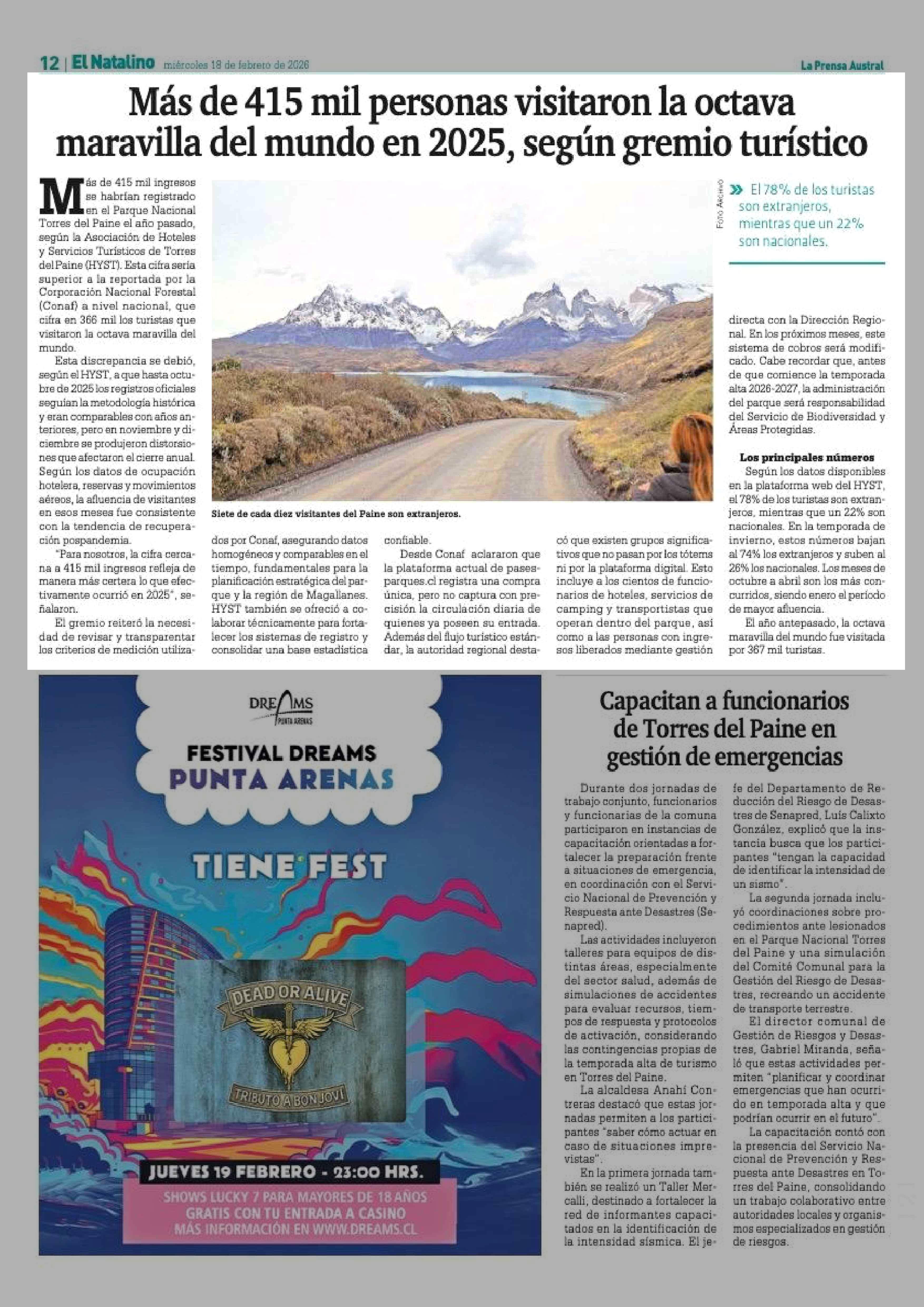 Más de 415 mil personas visitaron la octava maravilla del mundo en 2025, según gremio turístico 18-02-2026 La Prensa Austral |
