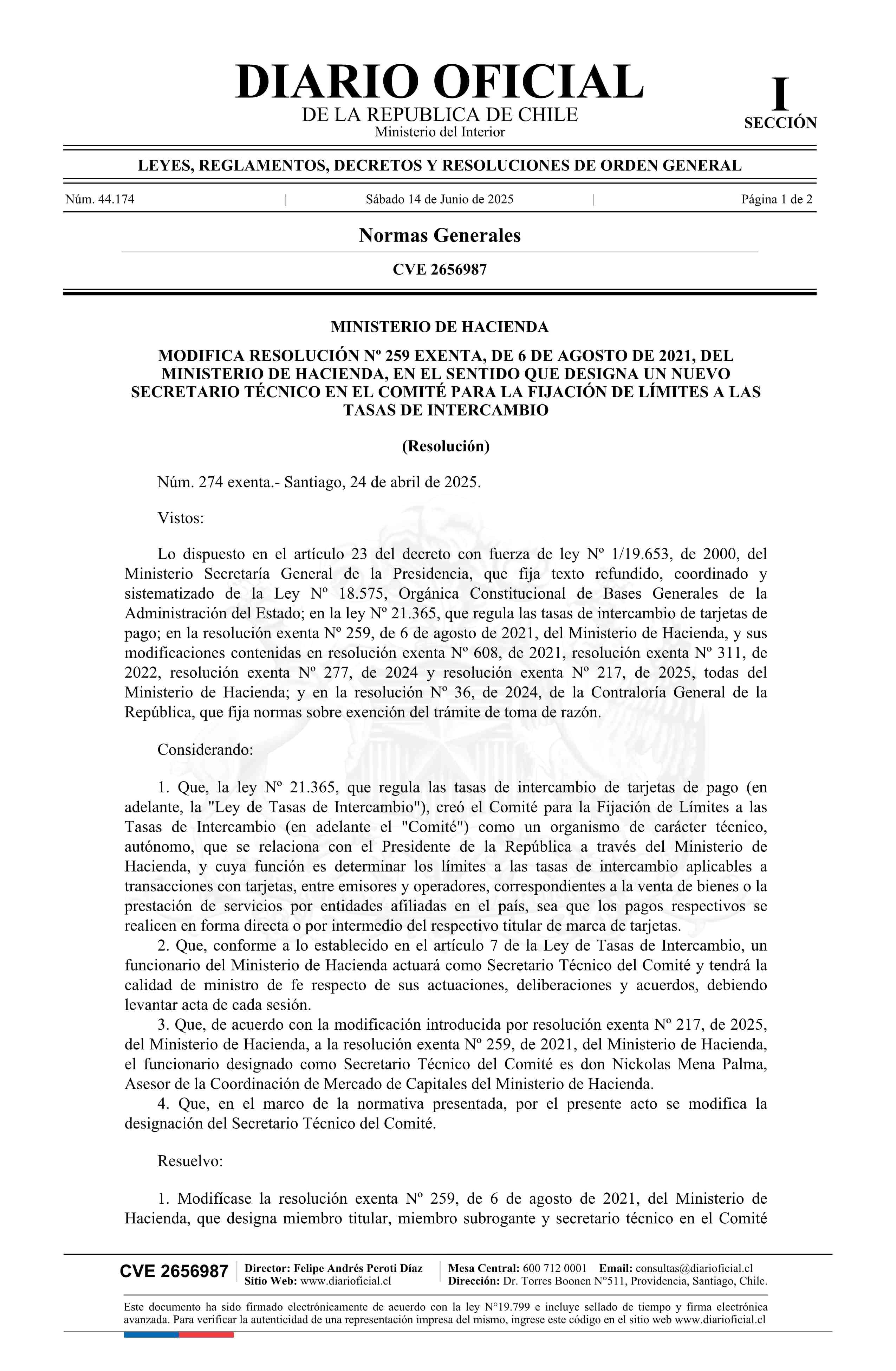 Resolución exenta número 274, de 2025.- Modifica resolución Nº 259 exenta, de 2021, en el sentido que designa un nuevo Secretario Técnico en el Comité para la Fijación de Límites a las Tasas de Intercambio 14-06-2025 DIARIO OFICIAL CHILE - BOLETÍN OFICIAL DE MINERÍA |