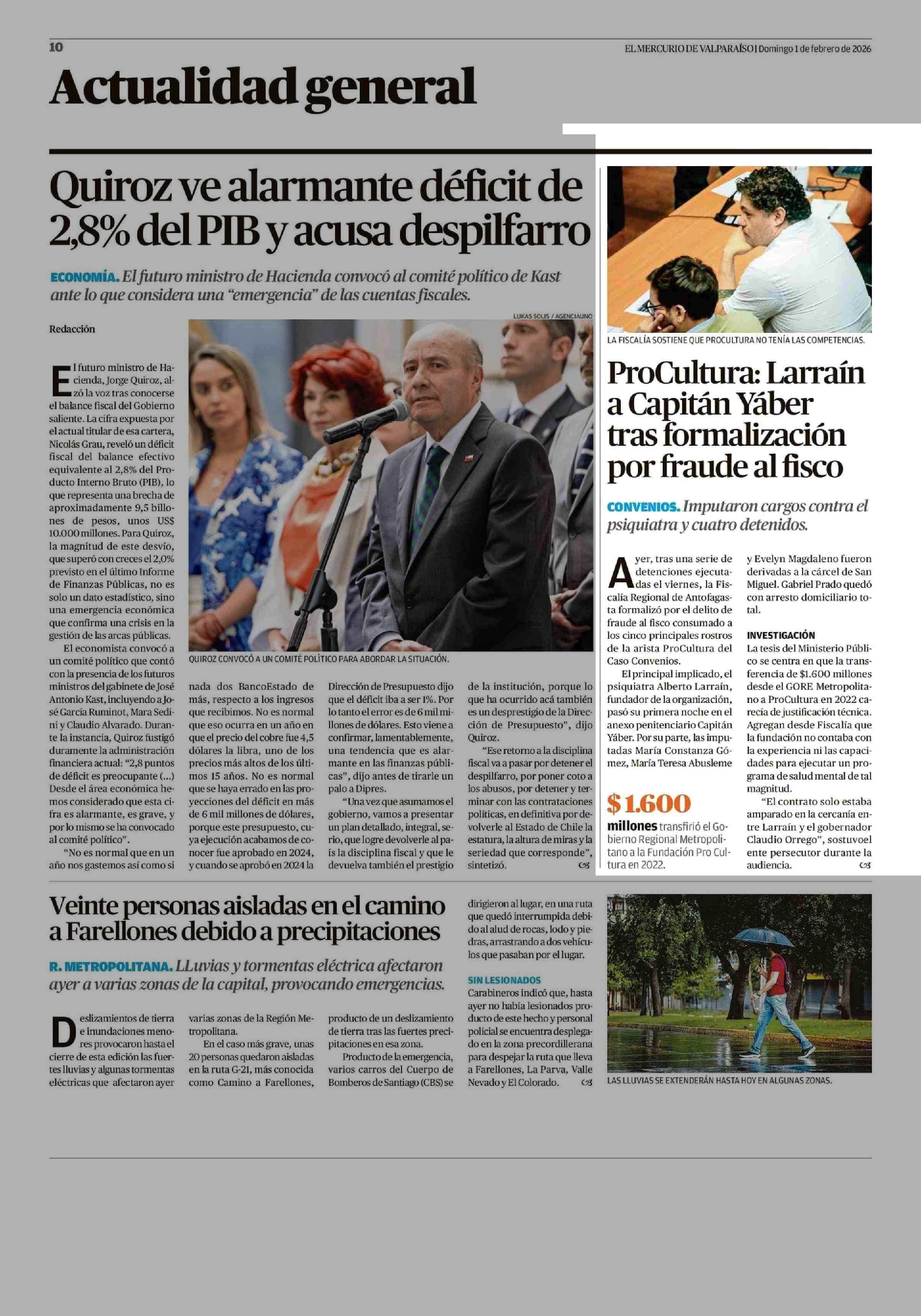 ProCultura: Larraín a Capitán Yáber tras formalización por fraude al fisco 01-02-2026 El Mercurio de Valparaíso |