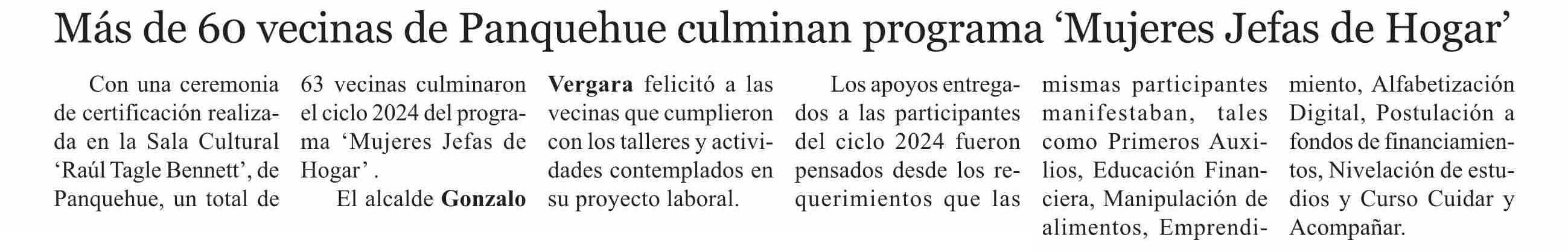 | Título: | Más de 60 vecinas de Panquehue culminan programa Mujeres Jefas de Hogar” |