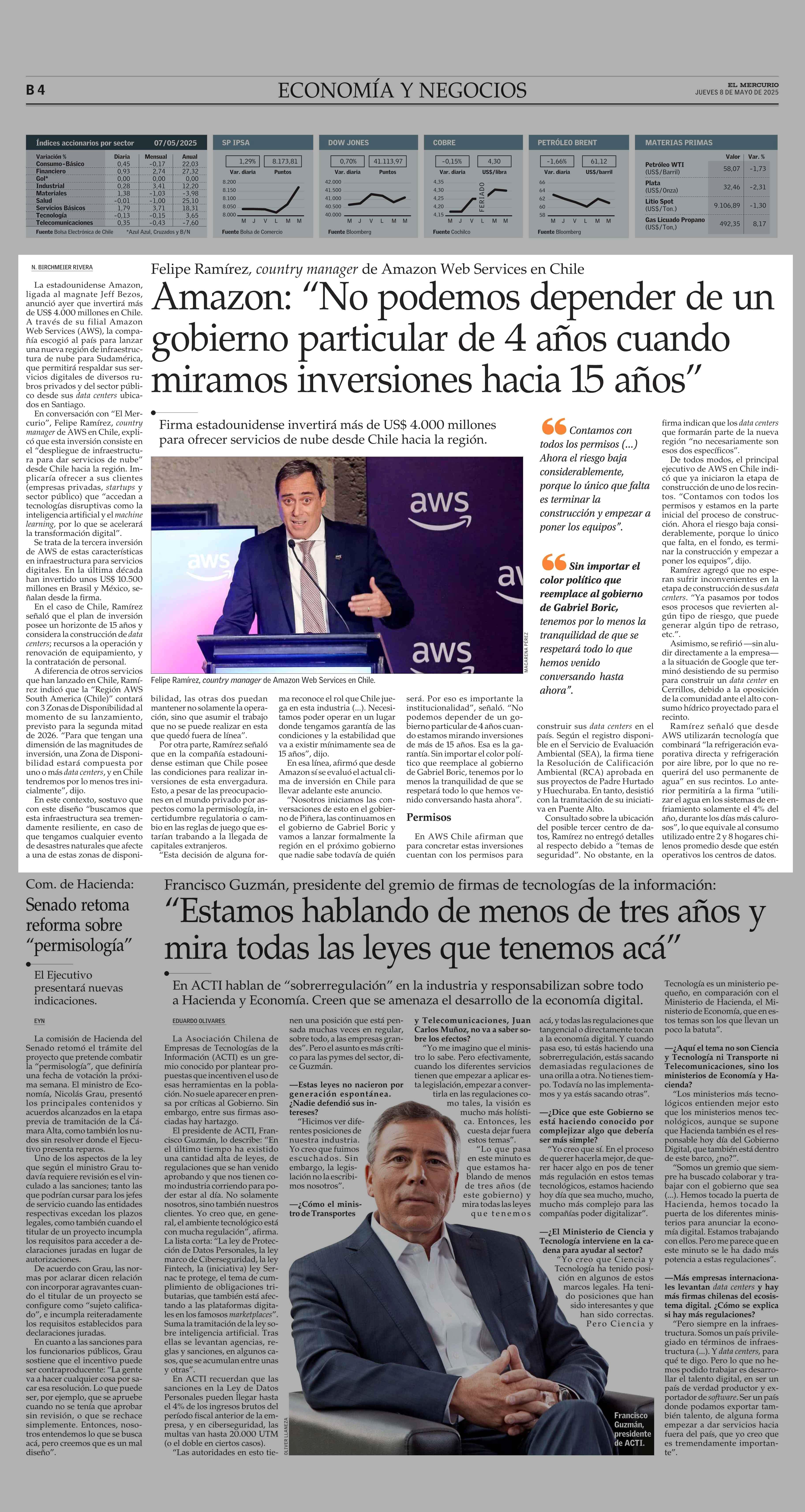 Amazon: “No podemos depender de un gobierno particular de 4 años cuando miramos inversiones hacia 15 años” 08-05-2025 El Mercurio |