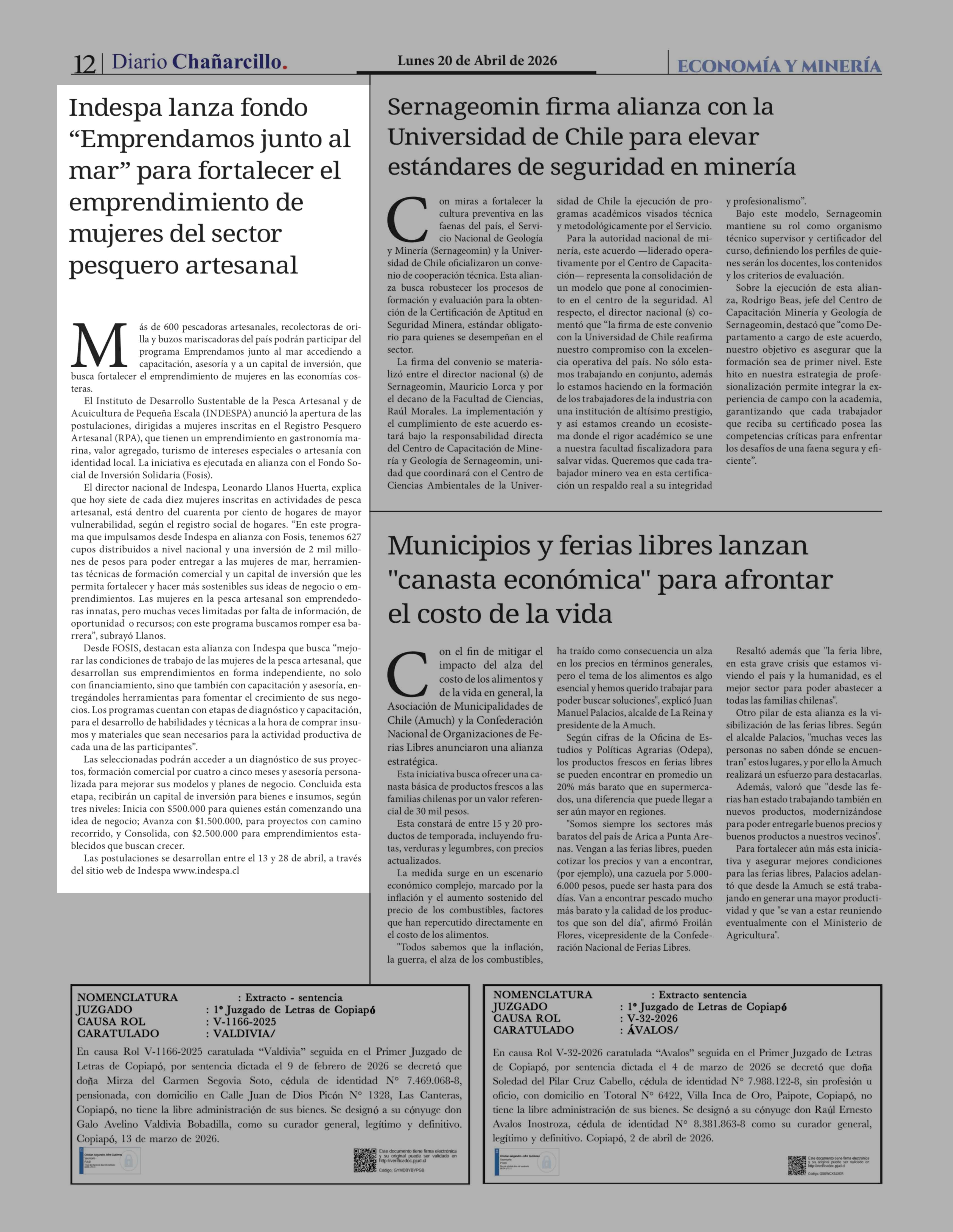 Indespa lanza fondo "Emprendamos junto al mar" para fortalecer el emprendimiento de mujeres del sector pesquero artesanal 20-04-2026 Diario Chañarcillo |
