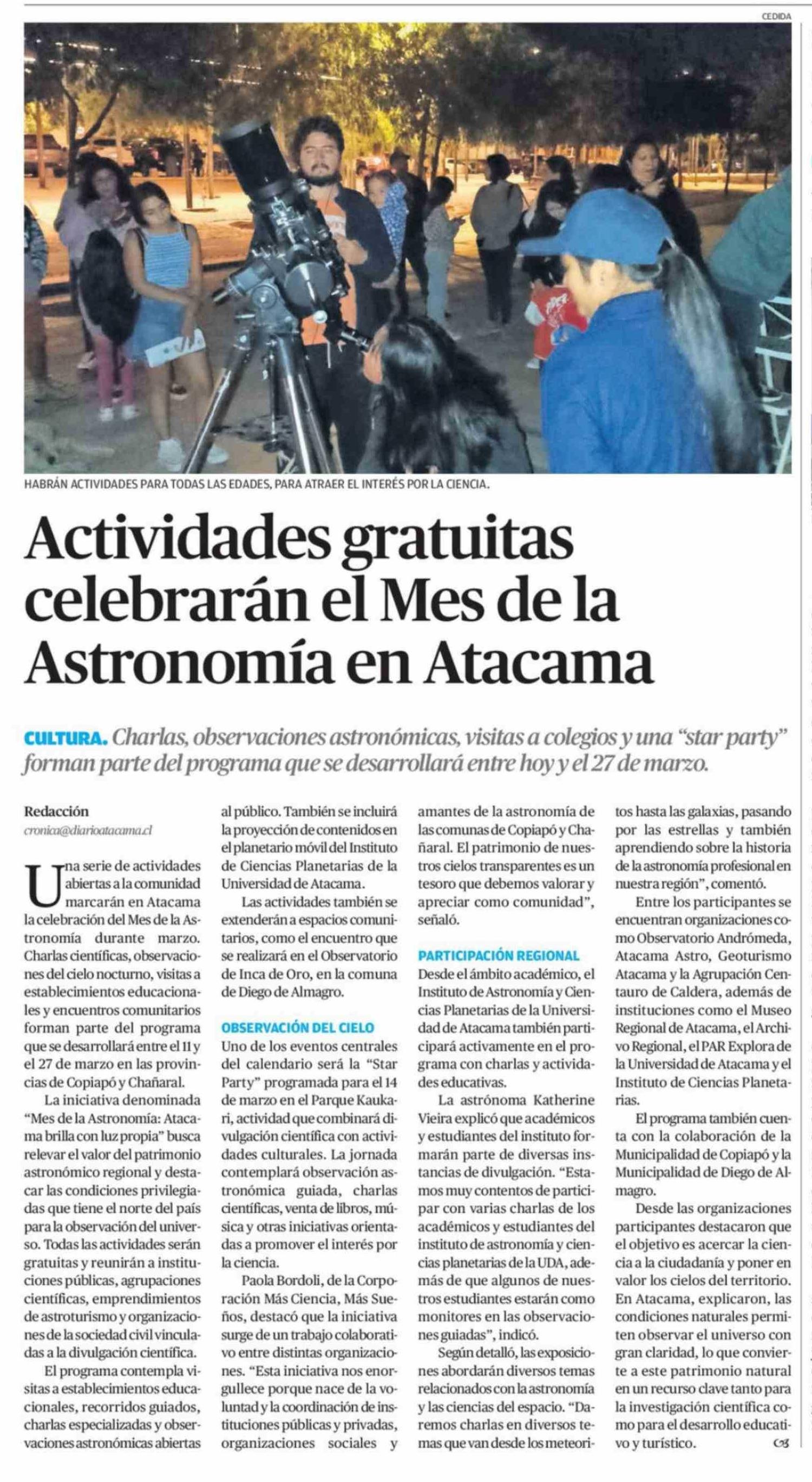 Actividades gratuitas celebrarán el Mes de la Astronomía en Atacama 11-03-2026 El Diario de Atacama |