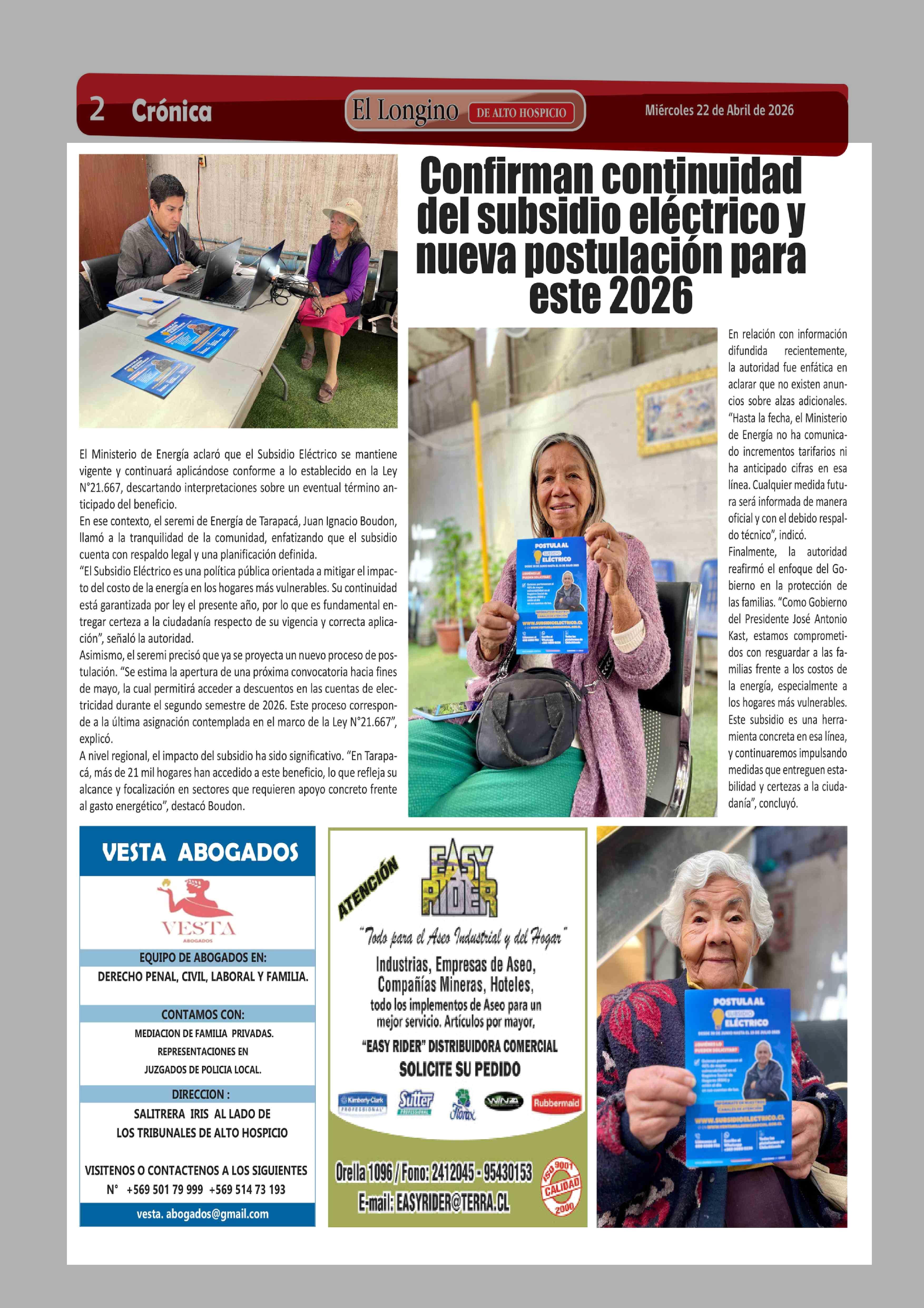 | Fecha: | 22-04-2026 | Sector: | Noticia general | Región: | Región de Tarapacá |