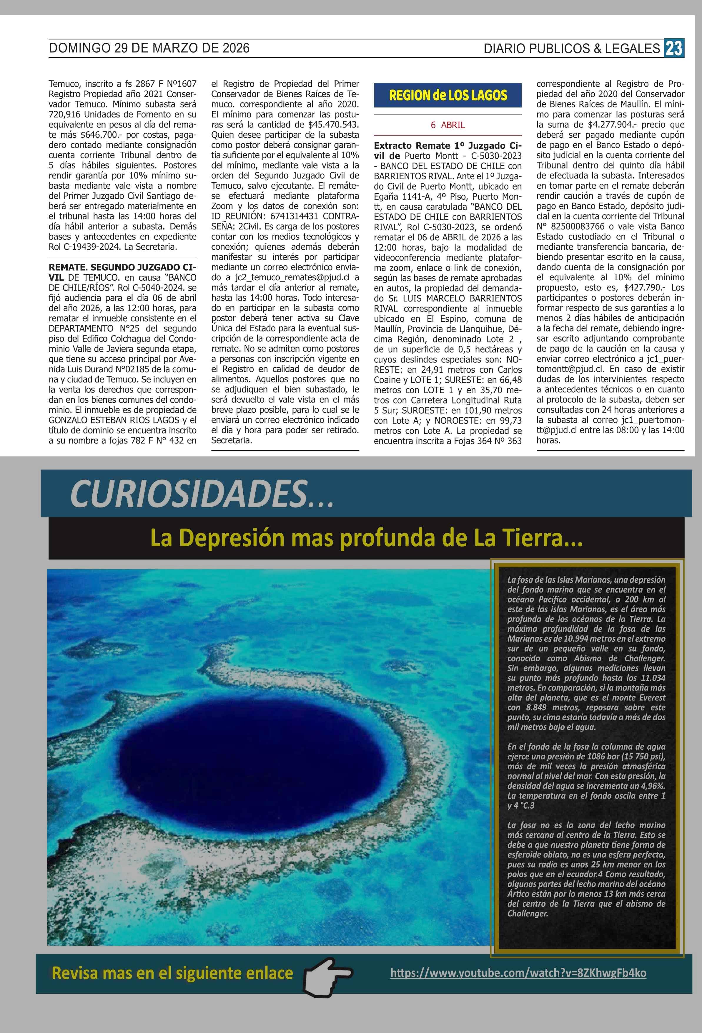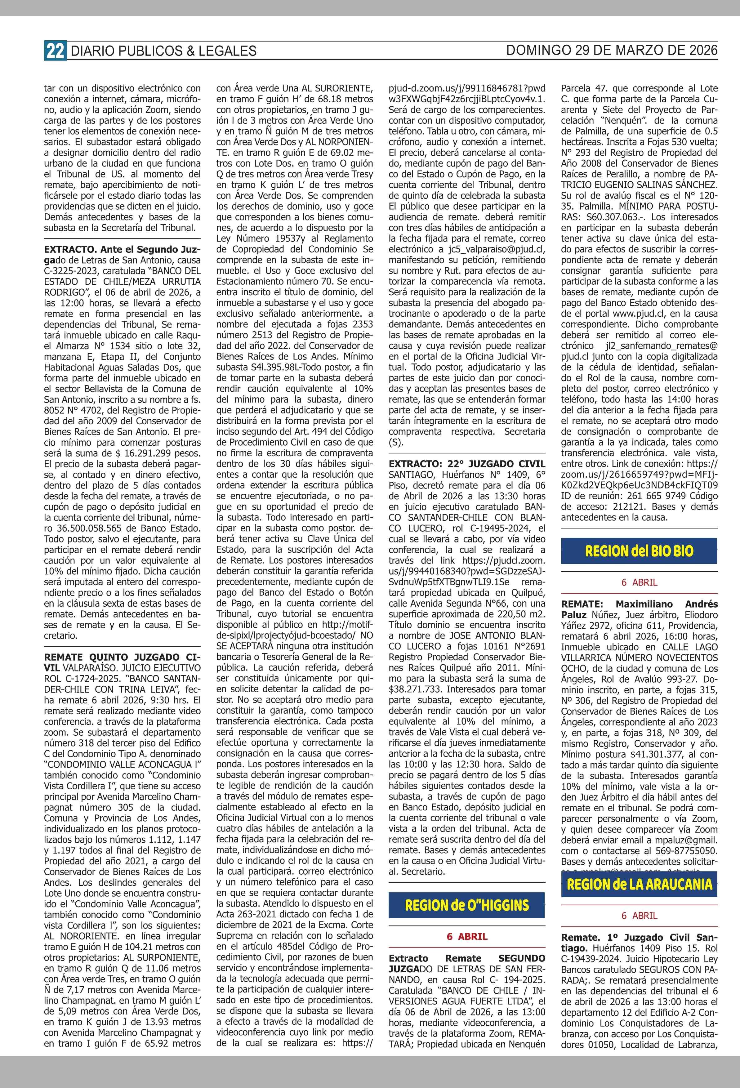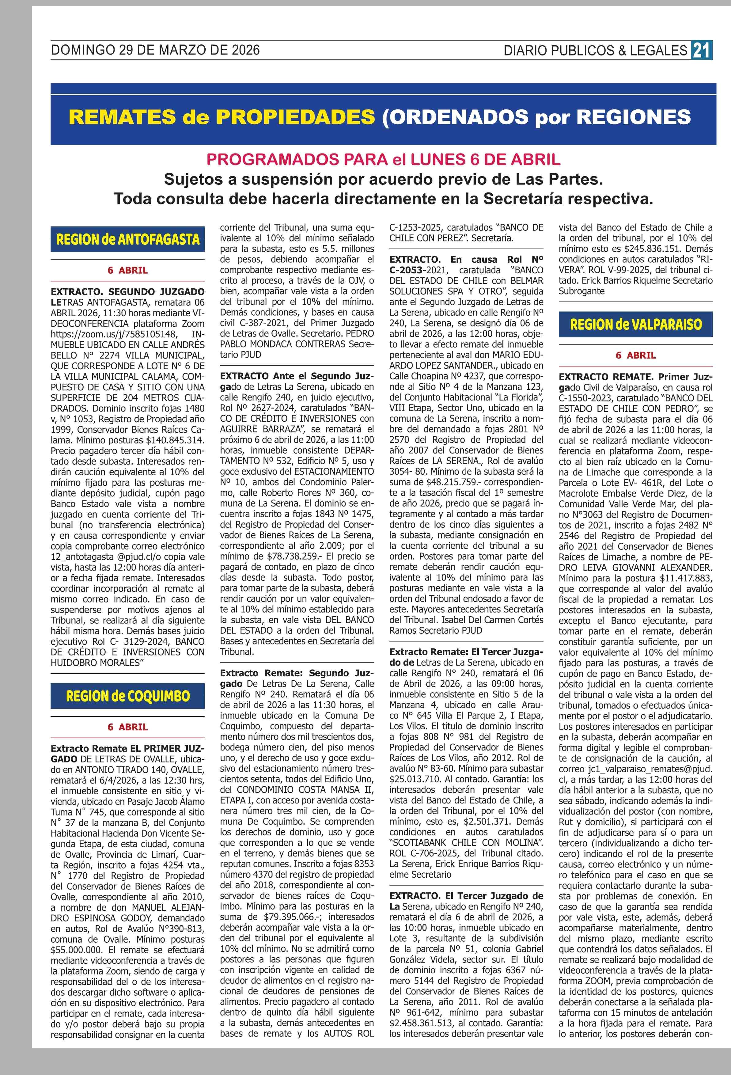REMATES de PROPIEDADES (ORDENADOS por REGIONES 29-03-2026 P&L Públicos y Legales |