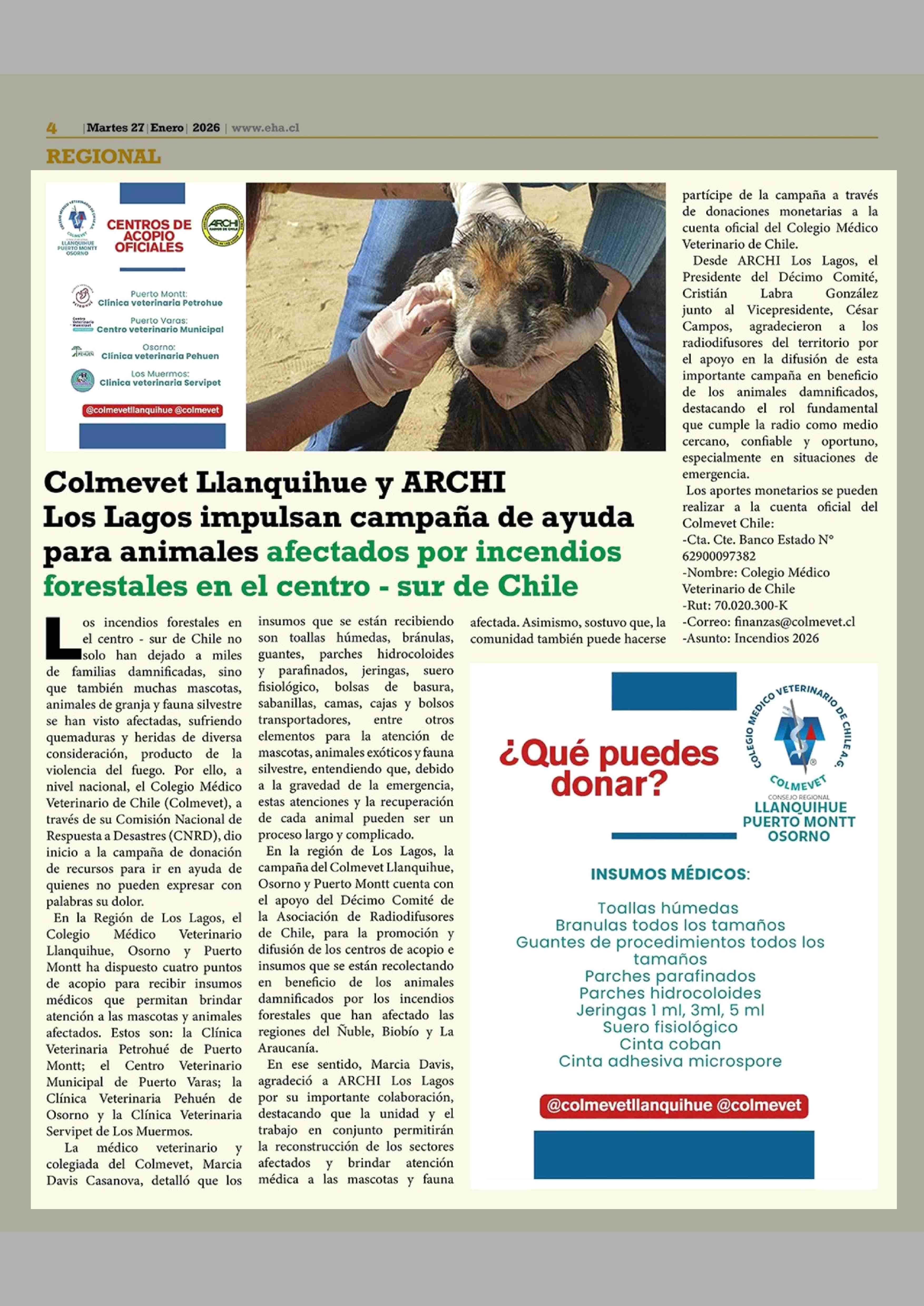 Colmevet Llanquihue y ARCHI Los Lagos impulsan campaña de ayuda para animales afectados por incendios forestales en el centro - sur de Chile 27-01-2026 El Heraldo Austral |