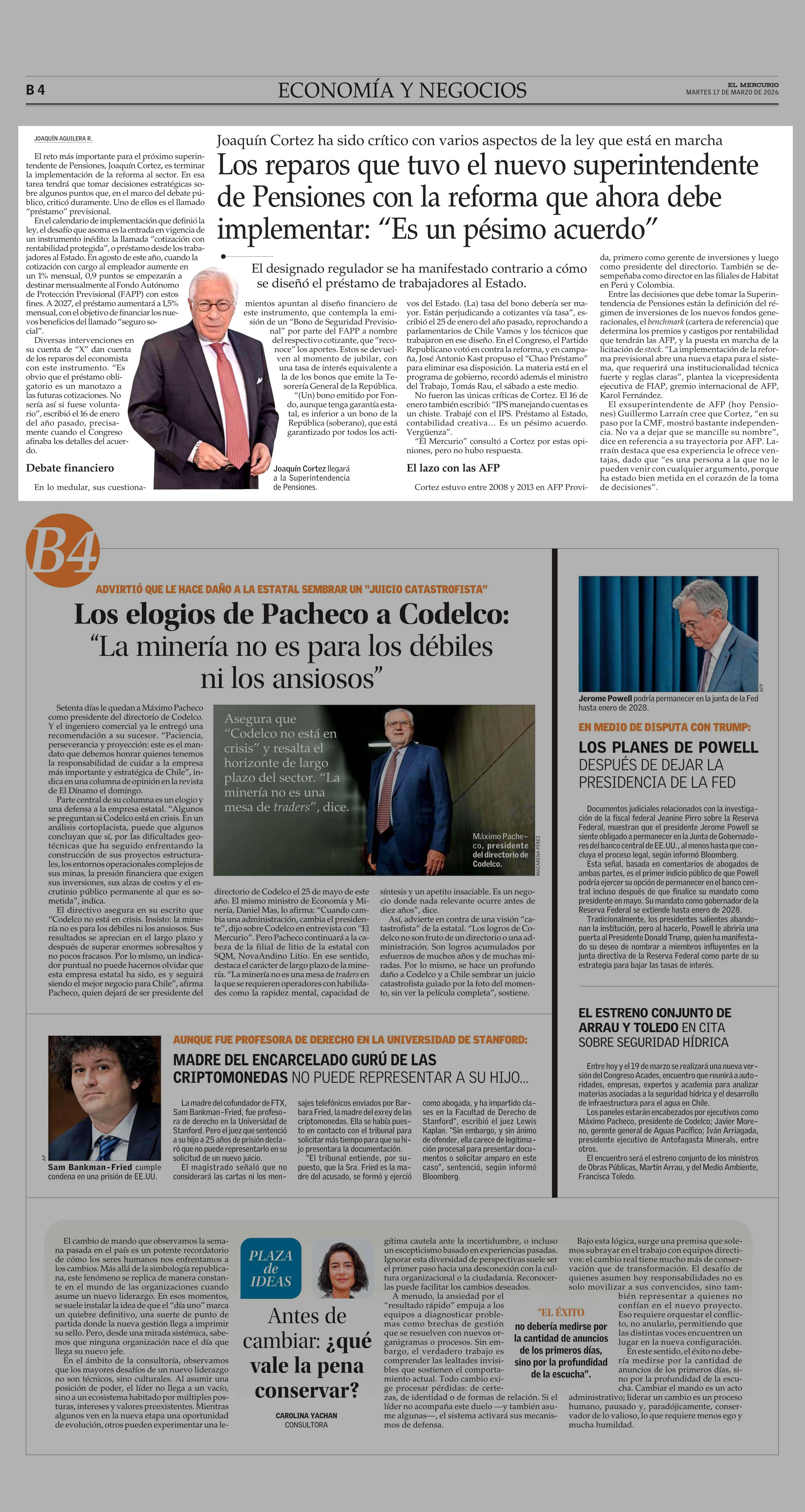 Los reparos que tuvo el nuevo superintendente de Pensiones con la reforma que ahora debe implementar: “Es un pésimo acuerdo” 17-03-2026 El Mercurio |