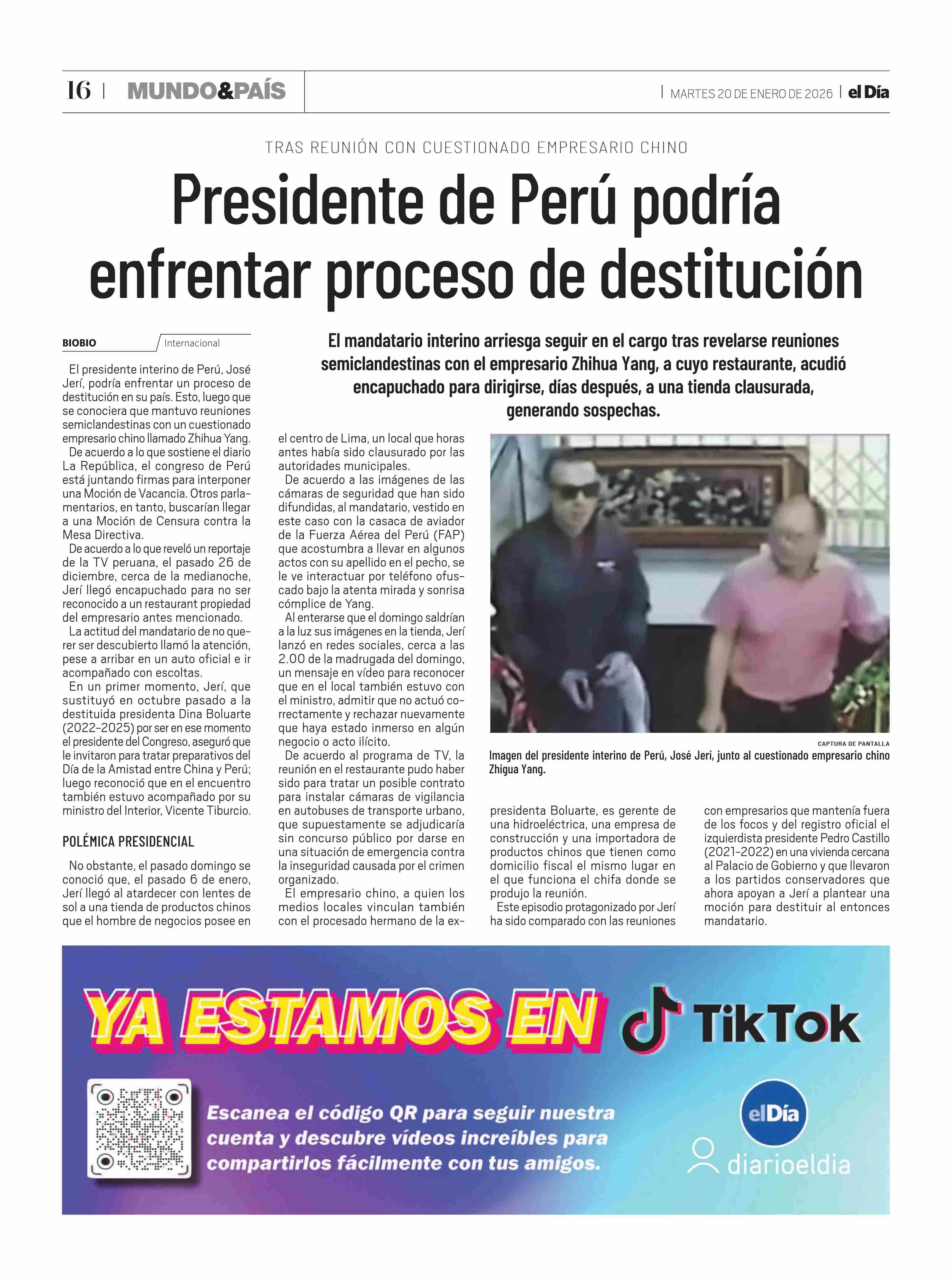 Presidente de Perú podría enfrentar proceso de destitución 20-01-2026 El Día |