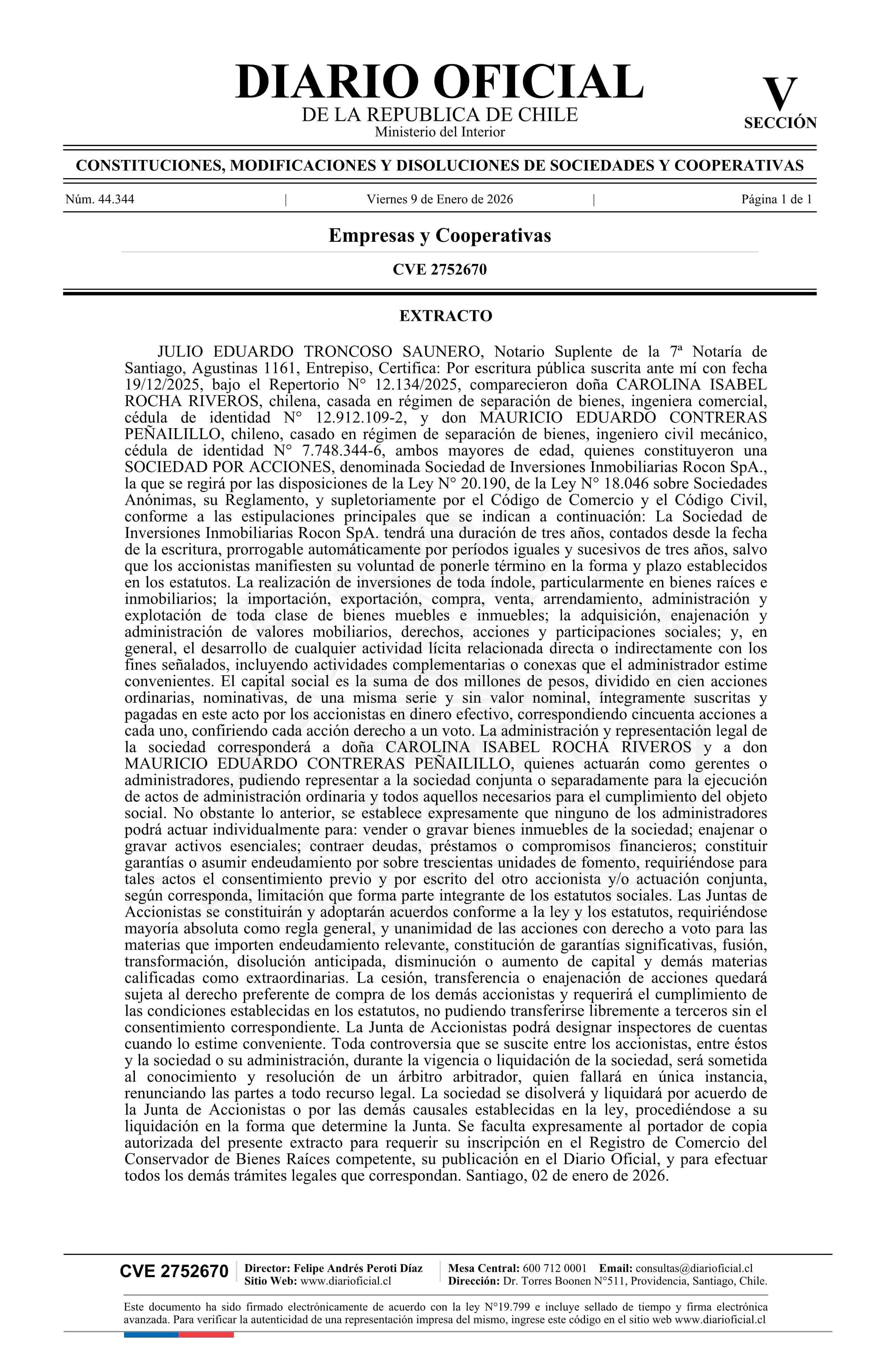 Sociedad de Inversiones Inmobiliarias Rocon SpA 09-01-2026 Diario Oficial Edición Electrónica |