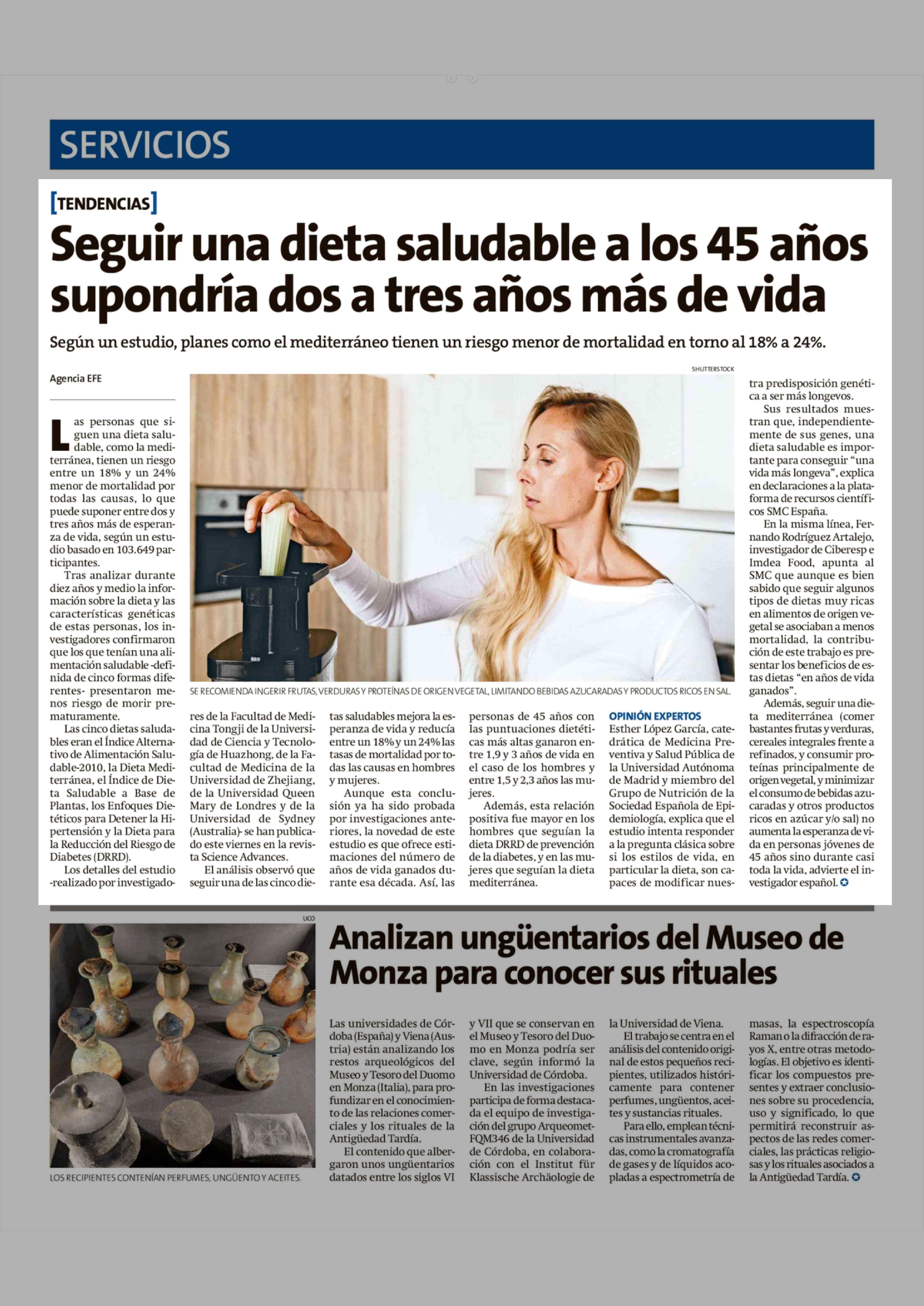 Título: Seguir una dieta saludable a los 45 años supondría dos a tres años más de vida