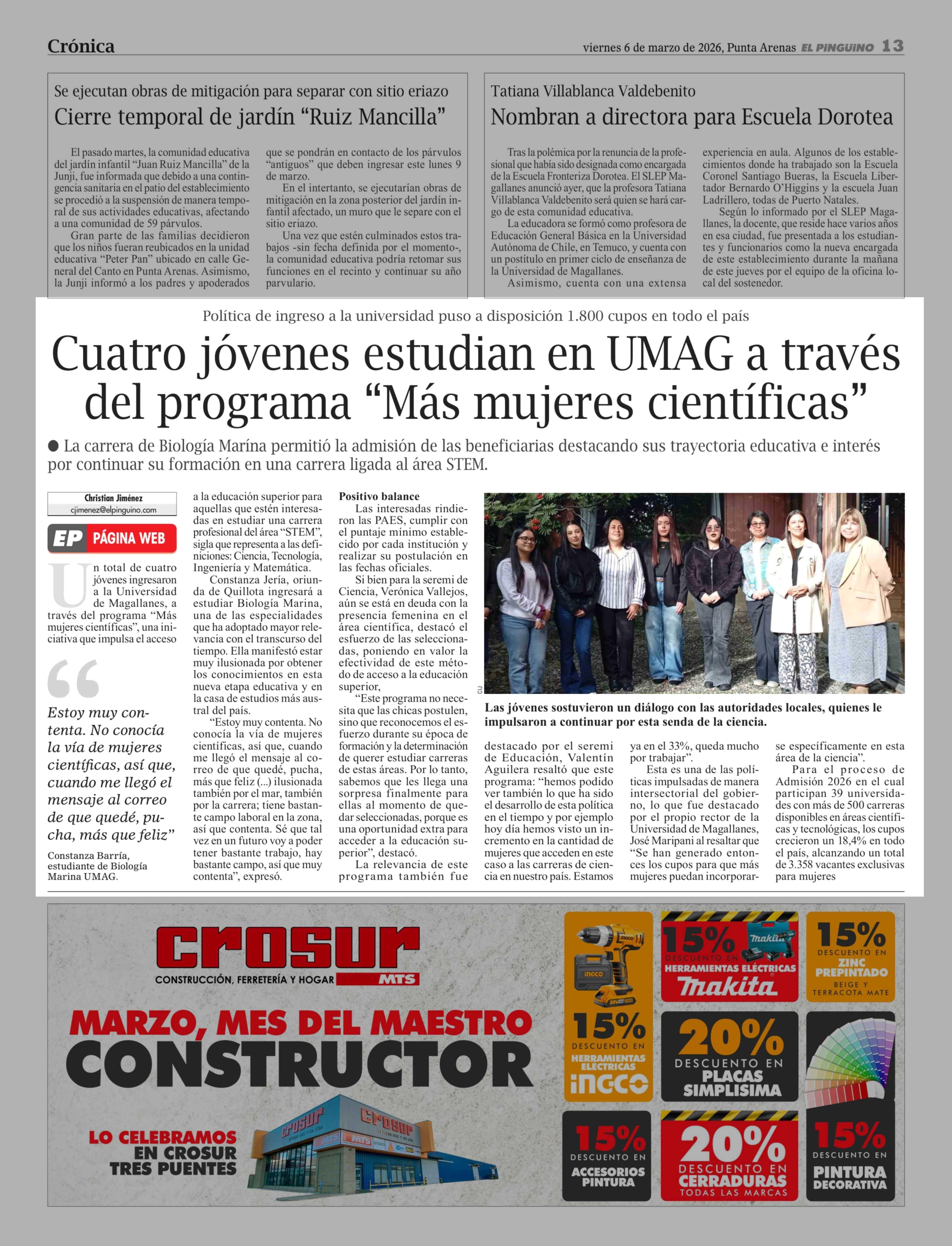 Cuatro jóvenes estudian en UMAG a través del programa "Más mujeres científicas" 06-03-2026 El Pingüino |