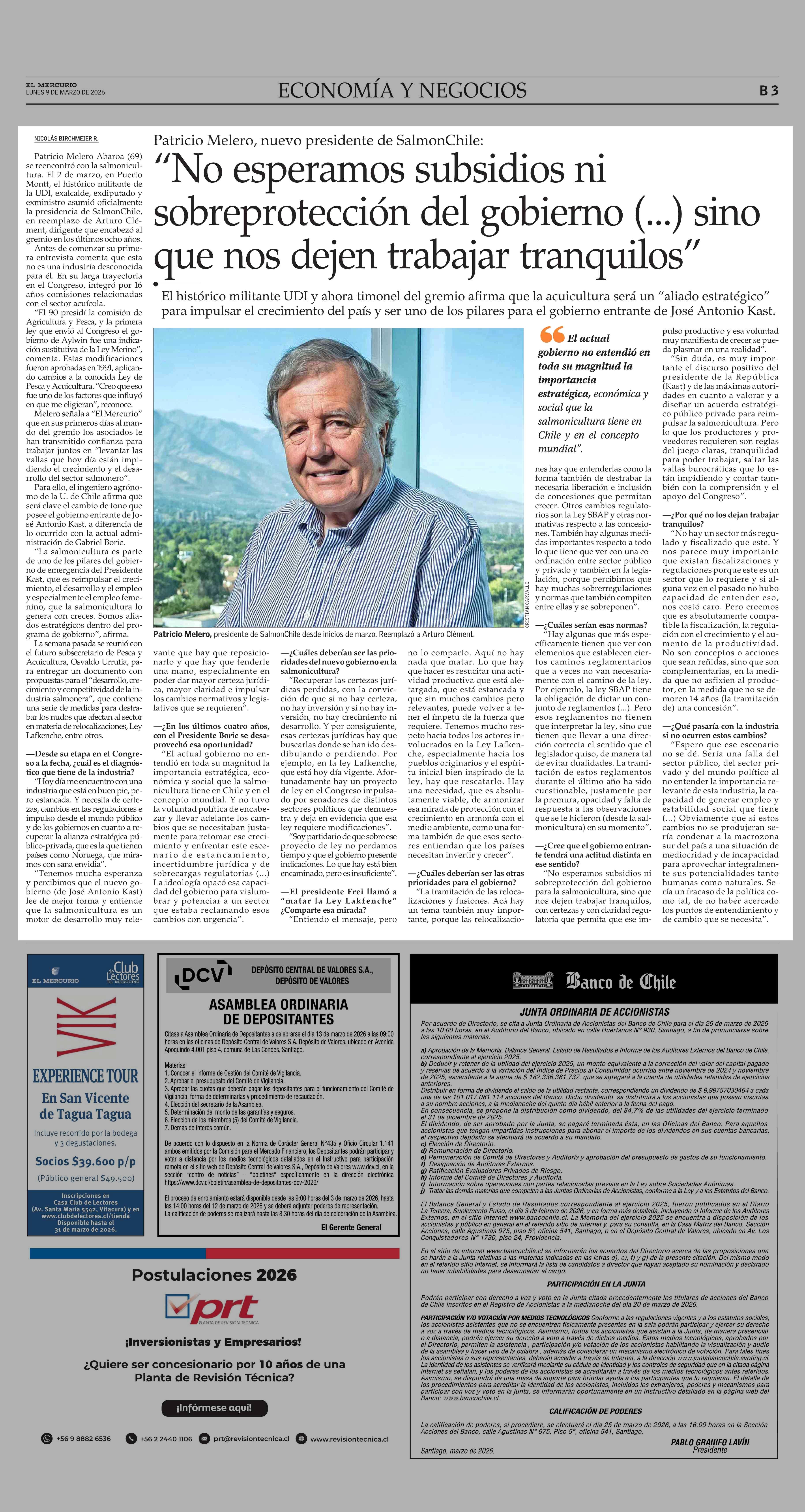 “No esperamos subsidios ni sobreprotección del gobierno (...) sino que nos dejen trabajar tranquilos” 09-03-2026 El Mercurio |