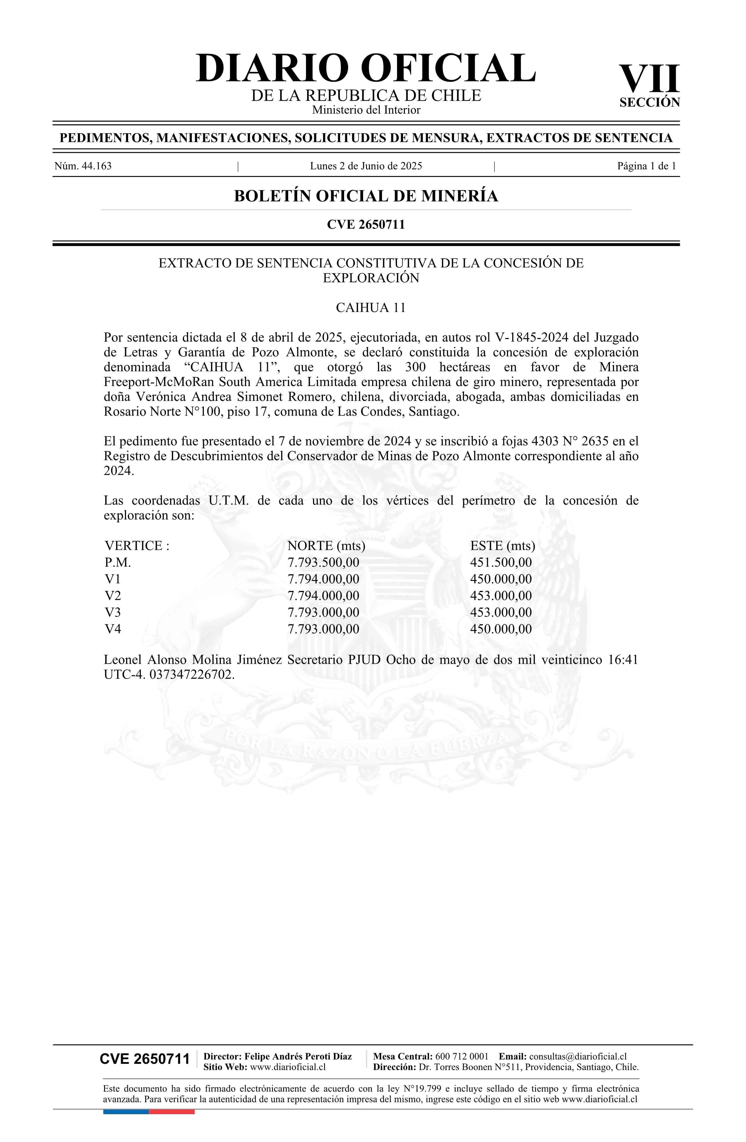 CAIHUA 11 / Minera Freeport-McMoRan South America Limitada 02-06-2025 DIARIO OFICIAL CHILE - BOLETÍN OFICIAL DE MINERÍA |