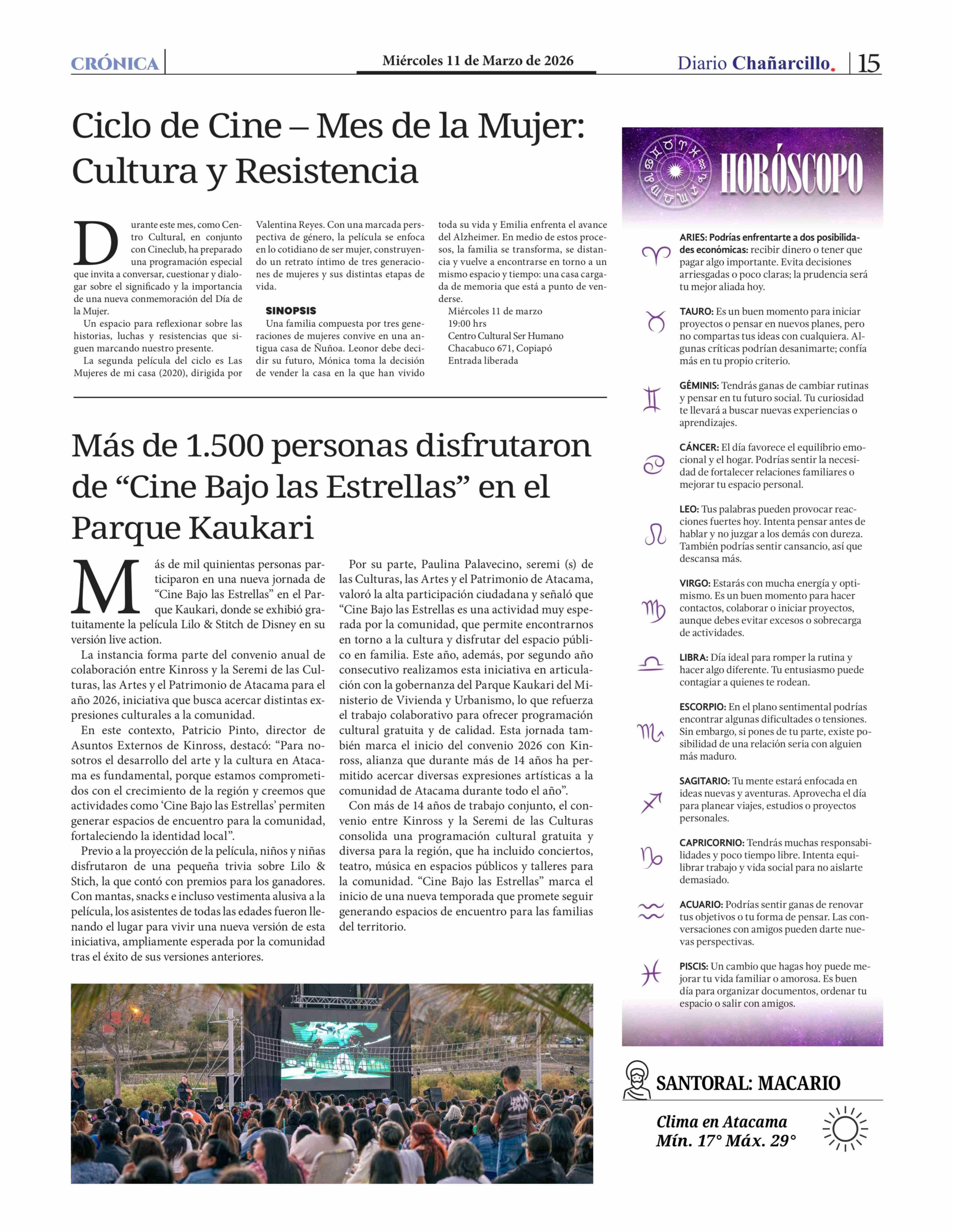 Más de 1.500 personas disfrutaron de "Cine Bajo las Estrellas" en el Parque Kaukari 11-03-2026 Diario Chañarcillo |