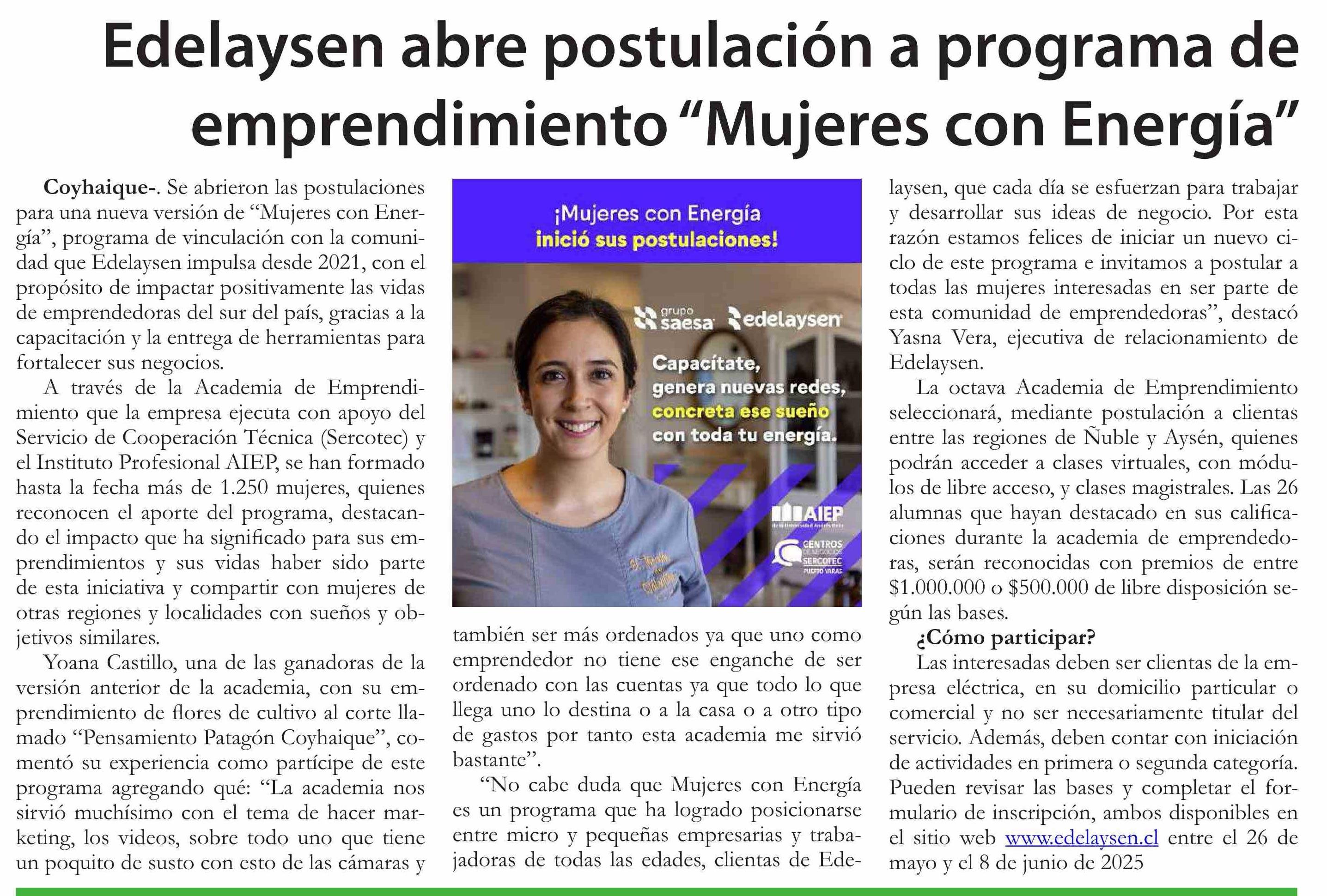 Edelaysen abre postulación a programa de emprendimiento “Mujeres con Energía” 28-05-2025 El Divisadero |