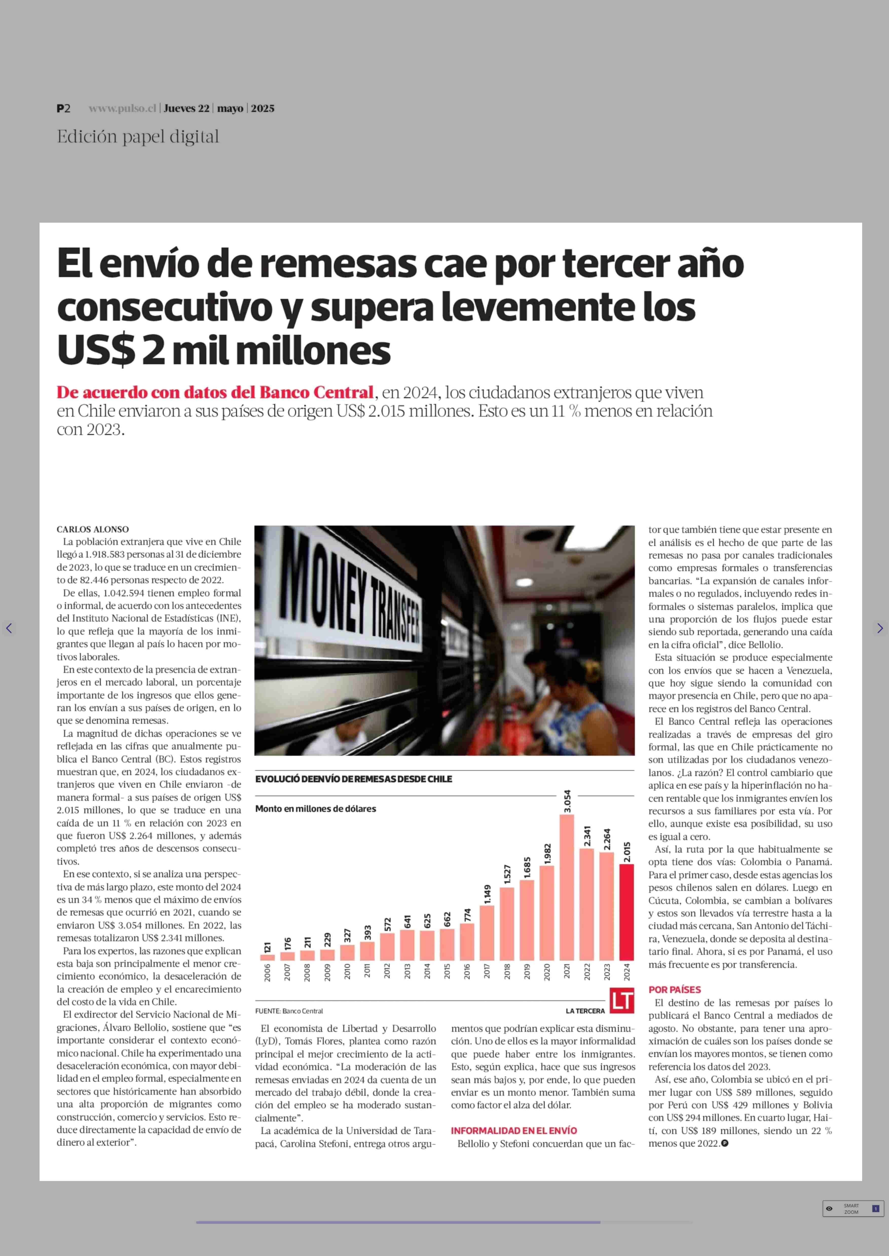 El envío de remesas cae por tercer año consecutivo y supera levemente los US$ 2 mil millones 22-05-2025 La Tercera |