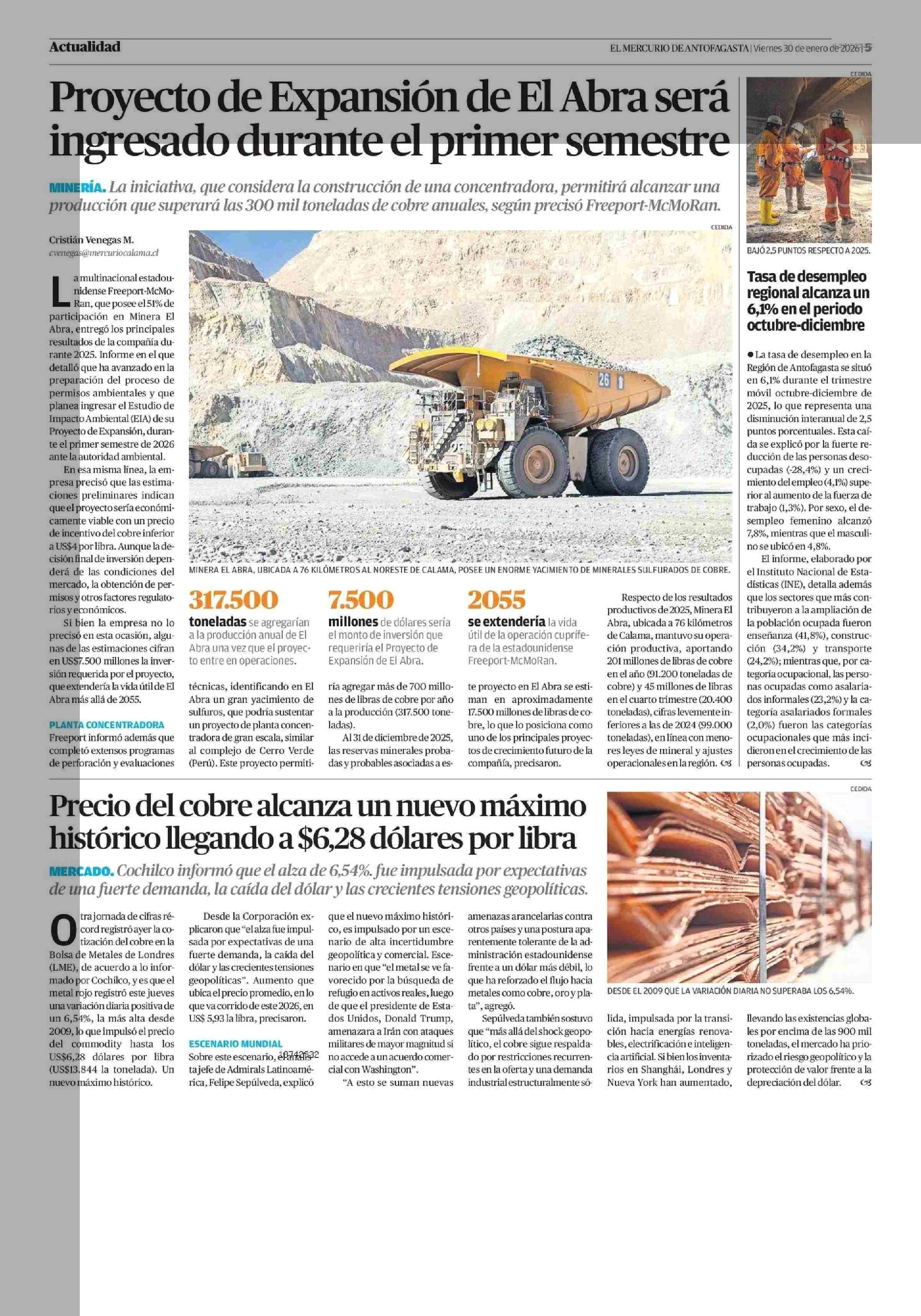 Proyecto de Expansión de El Abra será ingresado durante el primer semestre 30-01-2026 El Mercurio de Antofagasta |