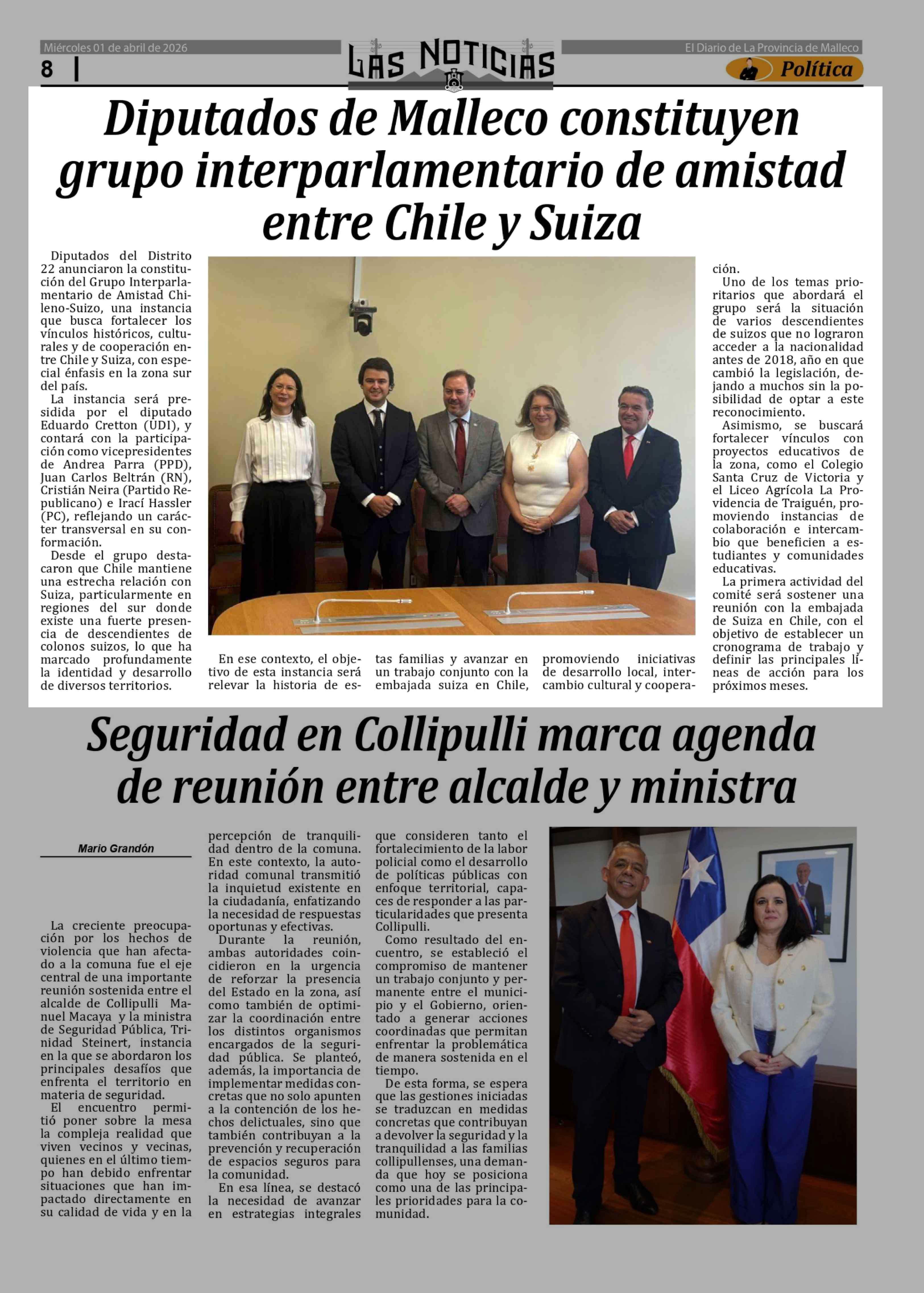 Título: Diputados de Malleco constituyen grupo interparlamentario de amistad entre Chile y Suiza