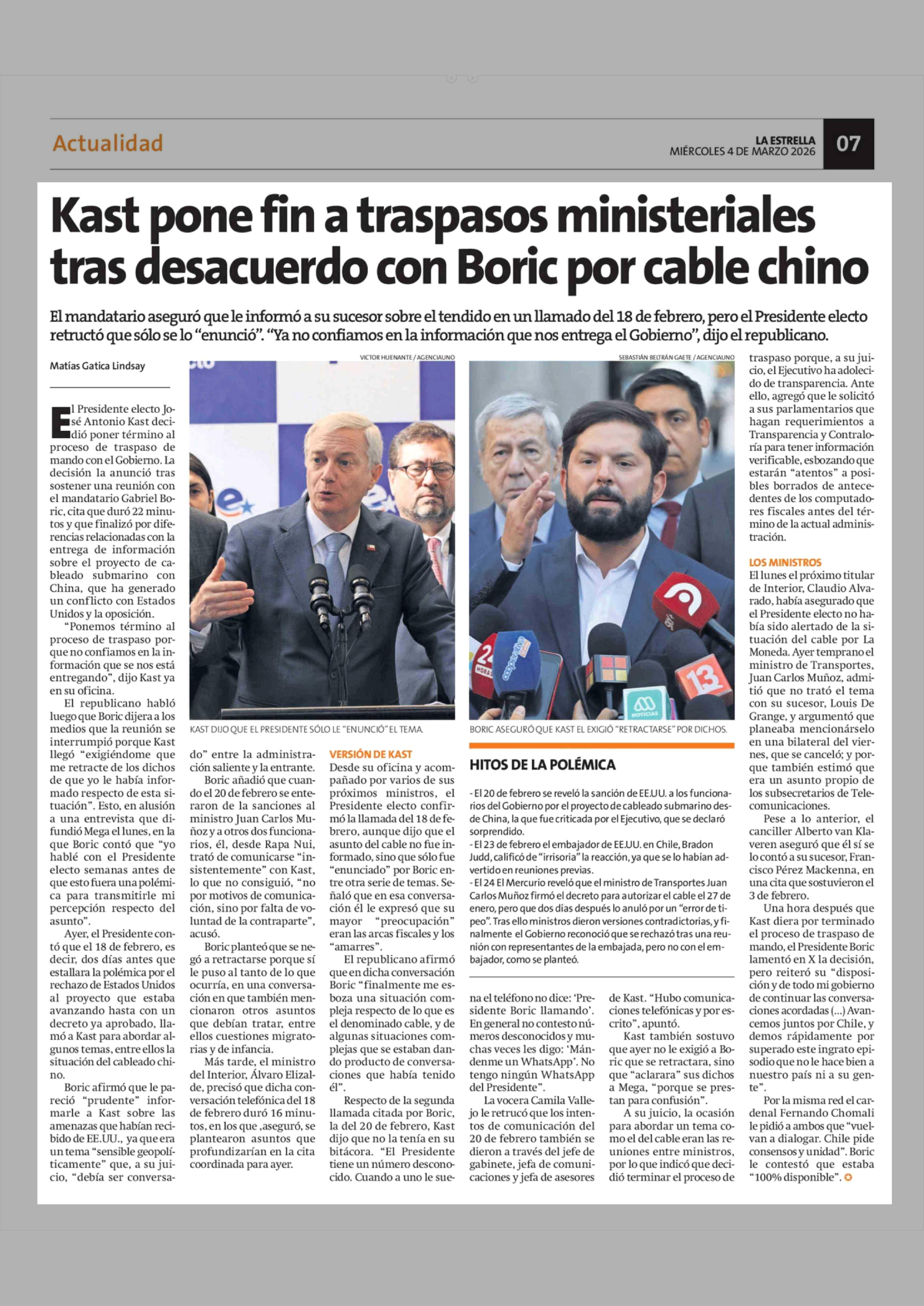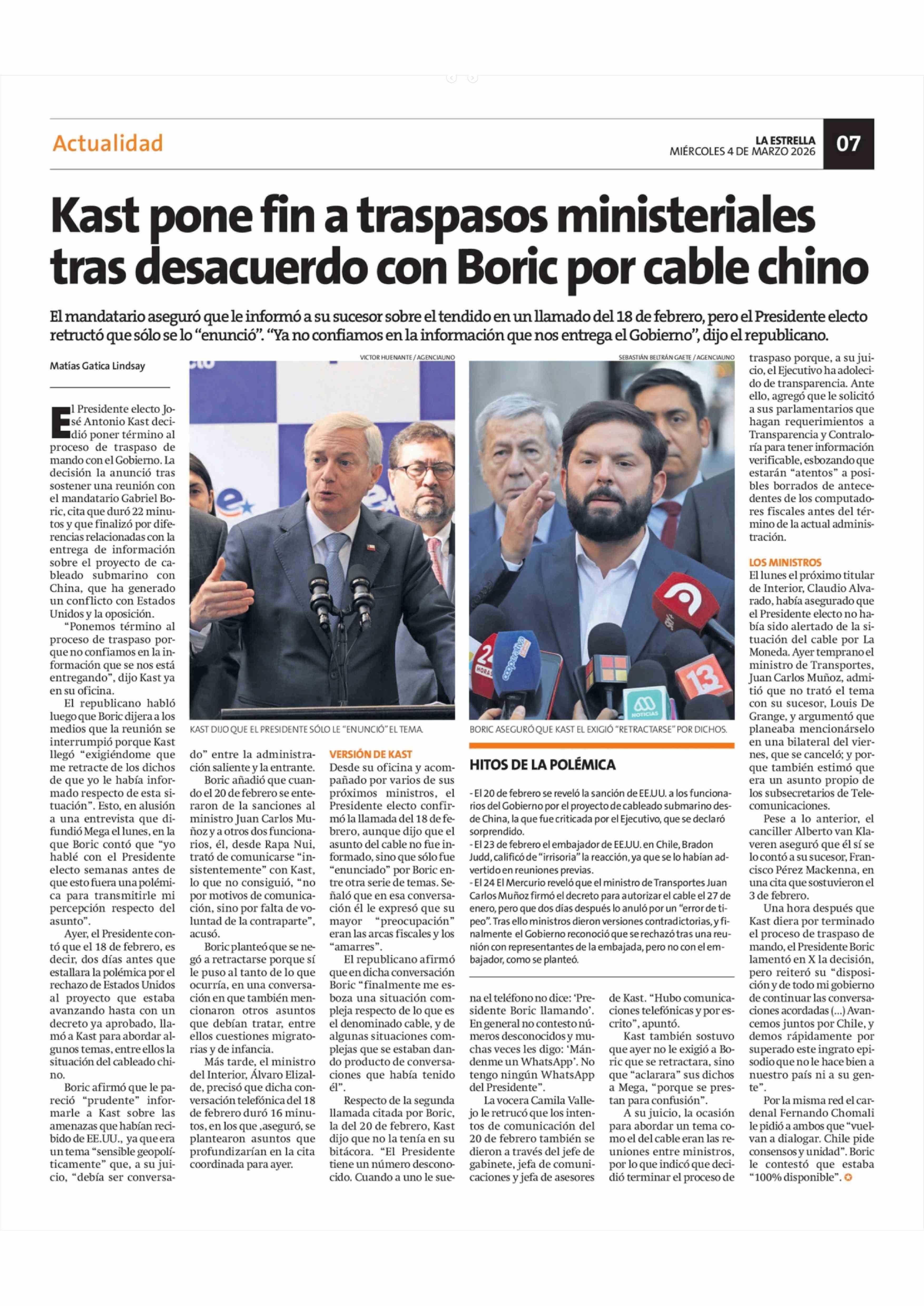 Kast pone fin a traspasos ministeriales tras desacuerdo con Boric por cable chino 04-03-2026 La Estrella de Antofagasta |